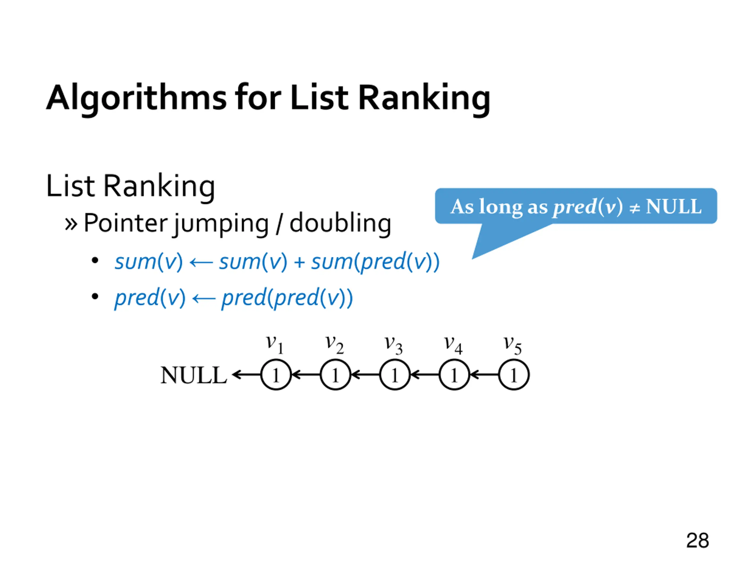 Algorithms for List Ranking List Ranking Compute sum(v) for each element v summing val(v) and values of all predecessors Why TeraSort cannot work? v1 v2 v3 v4 v5 NULL 1 2 3 4 5 27