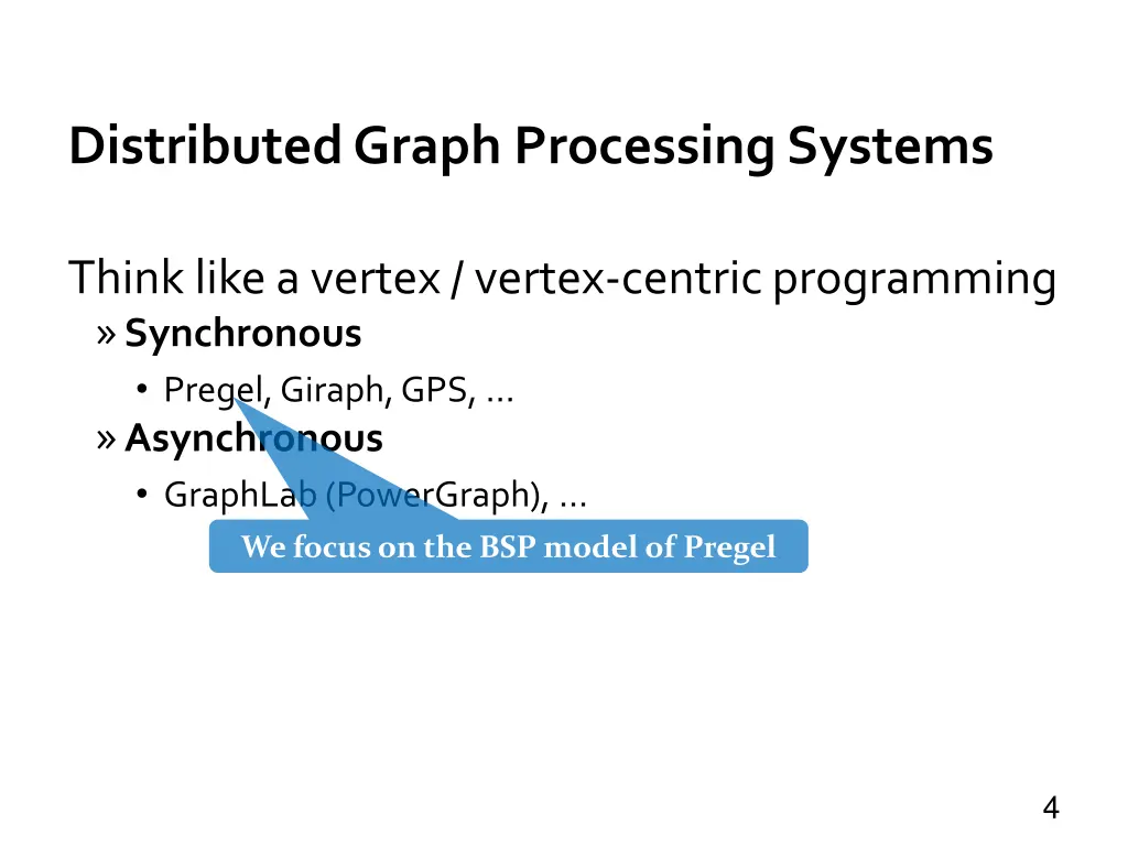 Distributed Graph Processing Systems Think like a vertex / vertex-centric programming Synchronous Pregel, Giraph, GPS, Asynchronous GraphLab (PowerGraph), We focus on the BSP model of Pregel 4