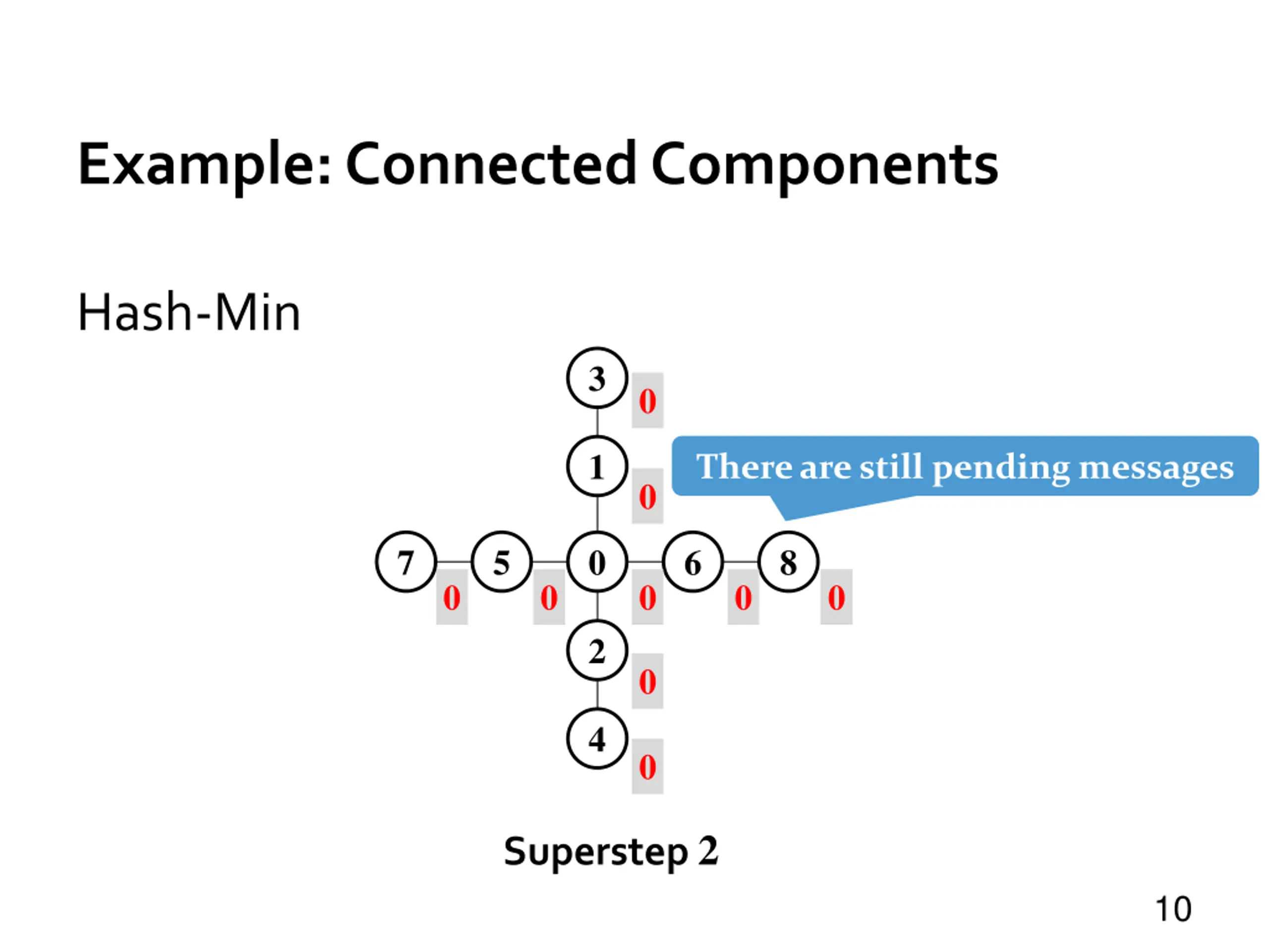 Example: Connected Components Hash-Min 3 0 1 There are still pending messages 0 7 5 0 6 8 0 0 0 0 0 2 0 4 0 Superstep 2 10