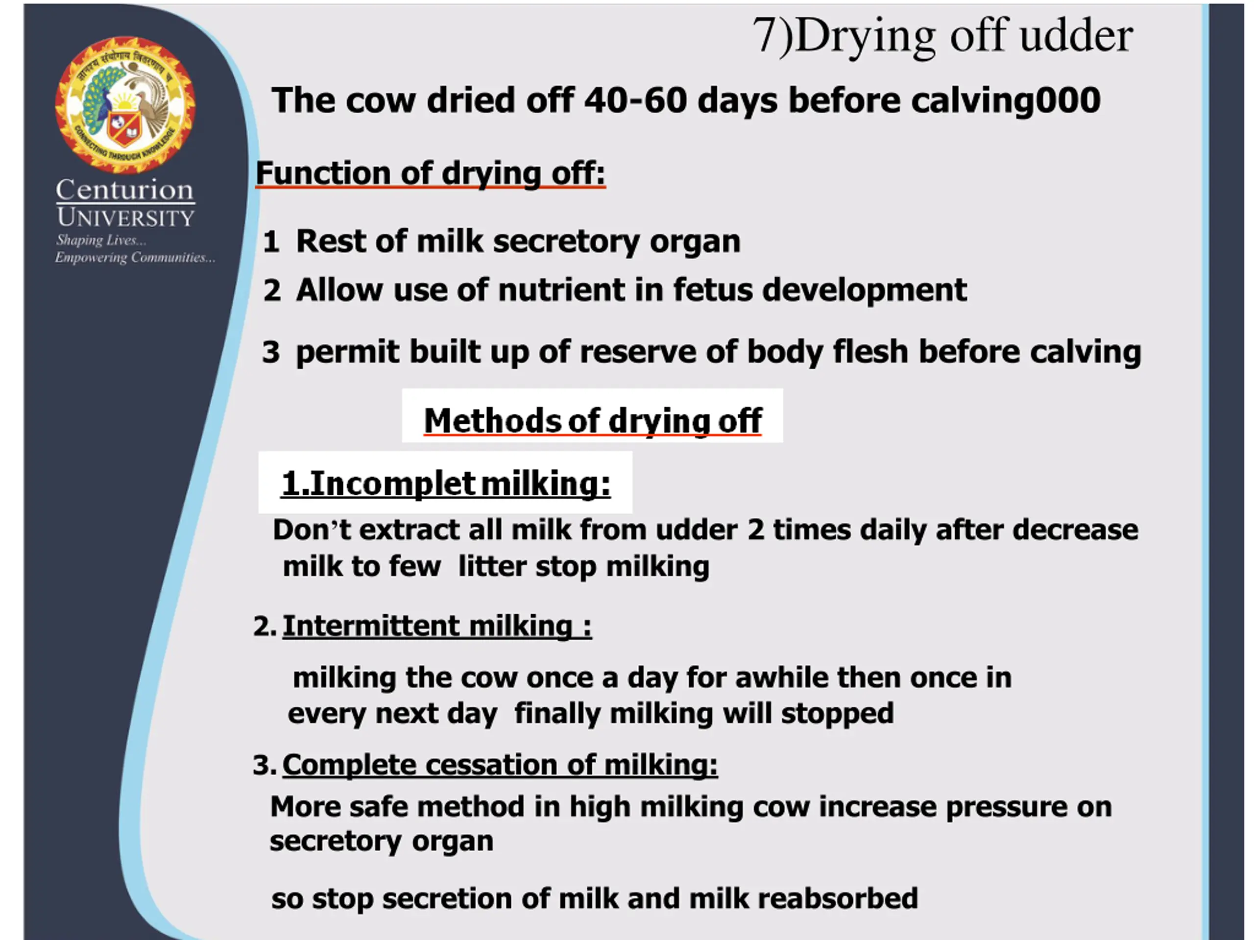7)Drying off udder The cow dried off 40-60 days before calving000 Function of drying off: 1 Rest of milk secretory organ 2 Allow use of nutrient in fetus development 3 permit built up of reserve of body flesh before calving Don t extract all milk from udder 2 times daily after decrease milk to few litter stop milking 2.Intermittent milking : milking the cow once a day for awhile then once in every next day finally milking will stopped 3.Complete cessation of milking: More safe method in high milking cow increase pressure on secretory organ so stop secretion of milk and milk reabsorbed