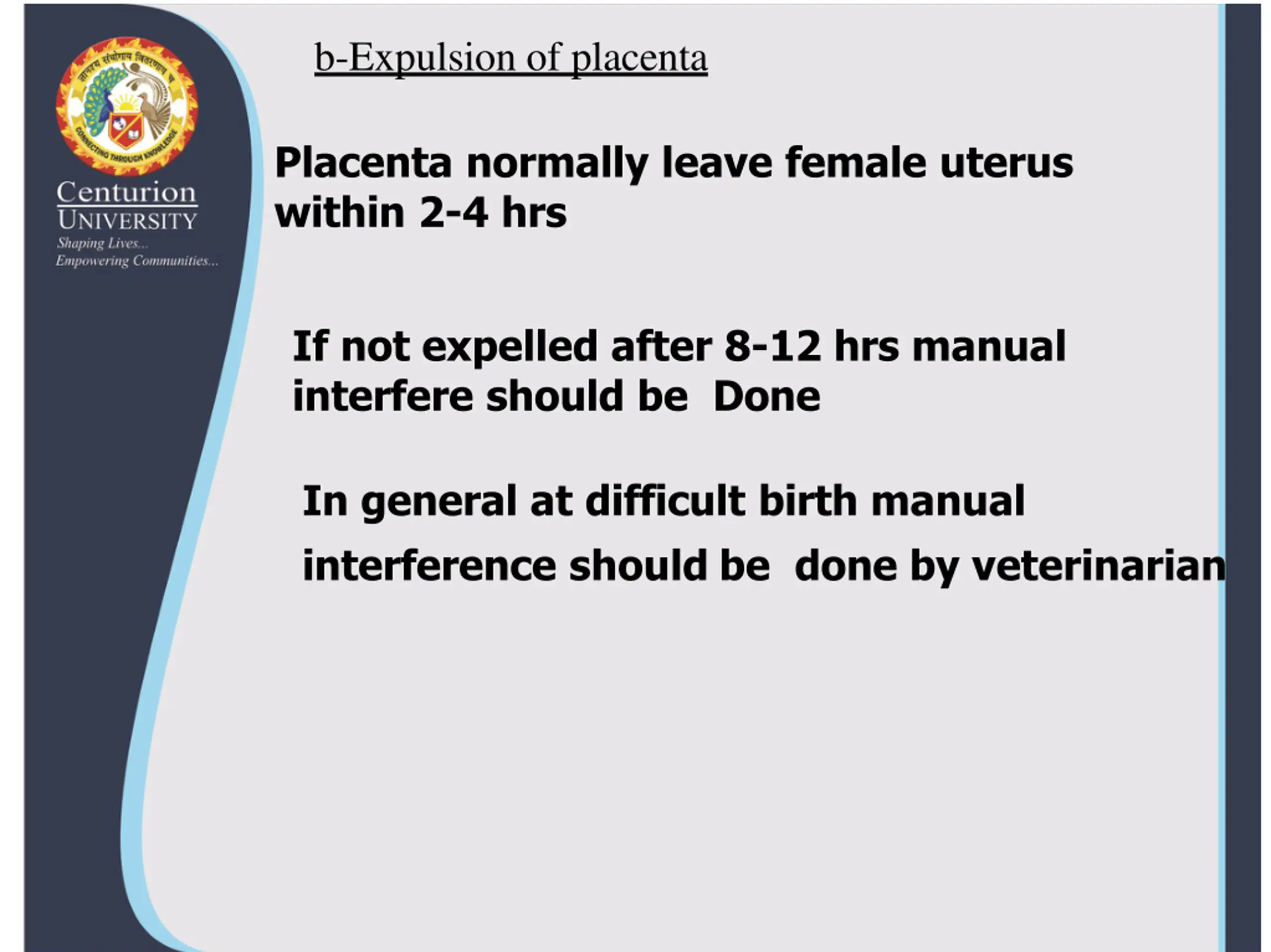 b-Expulsion of placenta Placenta normally leave female uterus within 2-4 hrs If not expelled after 8-12 hrs manual interfere should be Done In general at difficult birth manual interference should be done by veterinarian