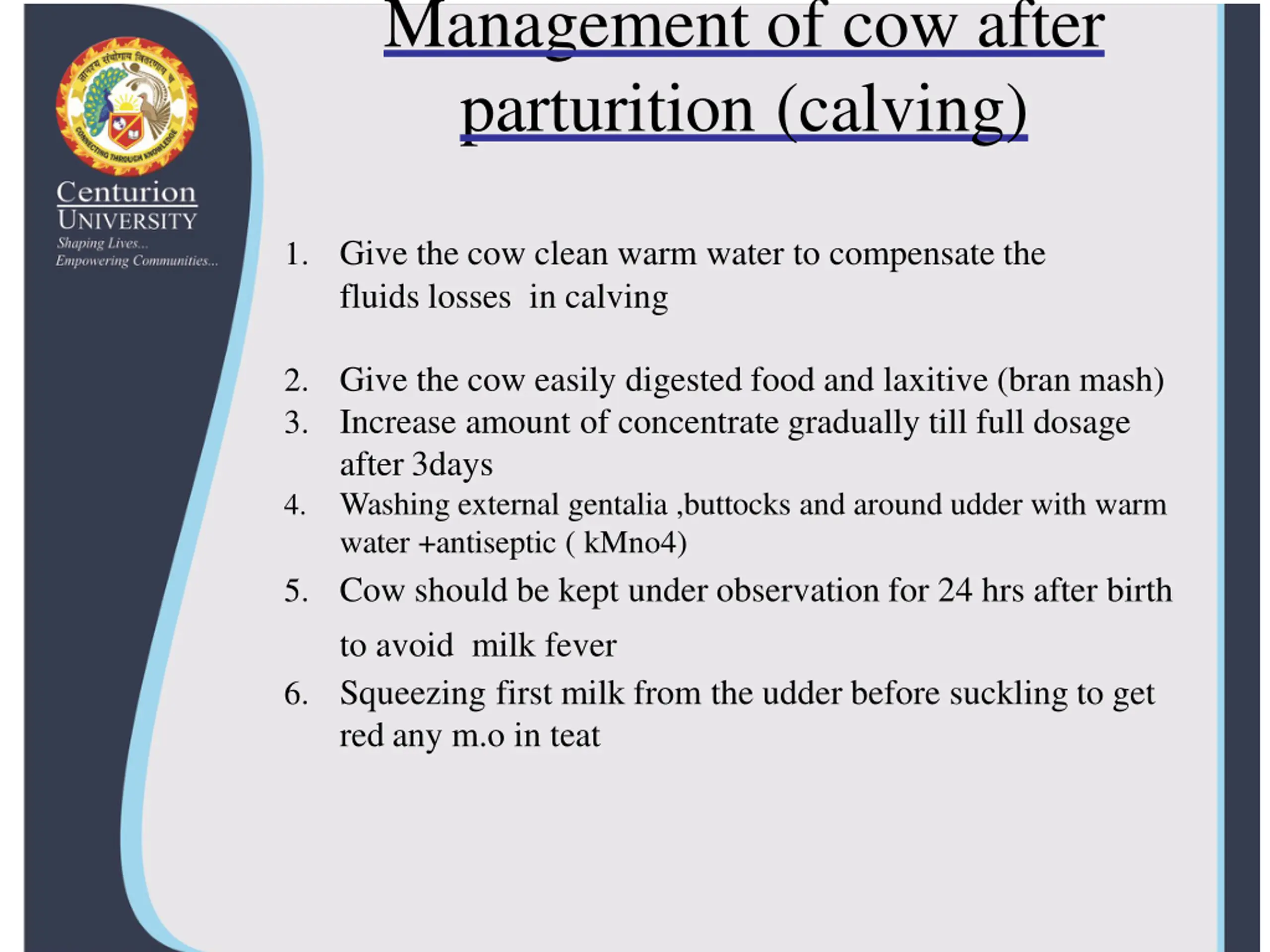 Management of cow after parturition (calving) 1. Give the cow clean warm water to compensate the fluids losses in calving 2. Give the cow easily digested food and laxitive (bran mash) 3. Increase amount of concentrate gradually till full dosage after 3days 4. Washing external gentalia ,buttocks and around udder with warm water +antiseptic ( kMno4) 5. Cow should be kept under observation for 24 hrs after birth to avoid milk fever 6. Squeezing first milk from the udder before suckling to get red any m.o in teat