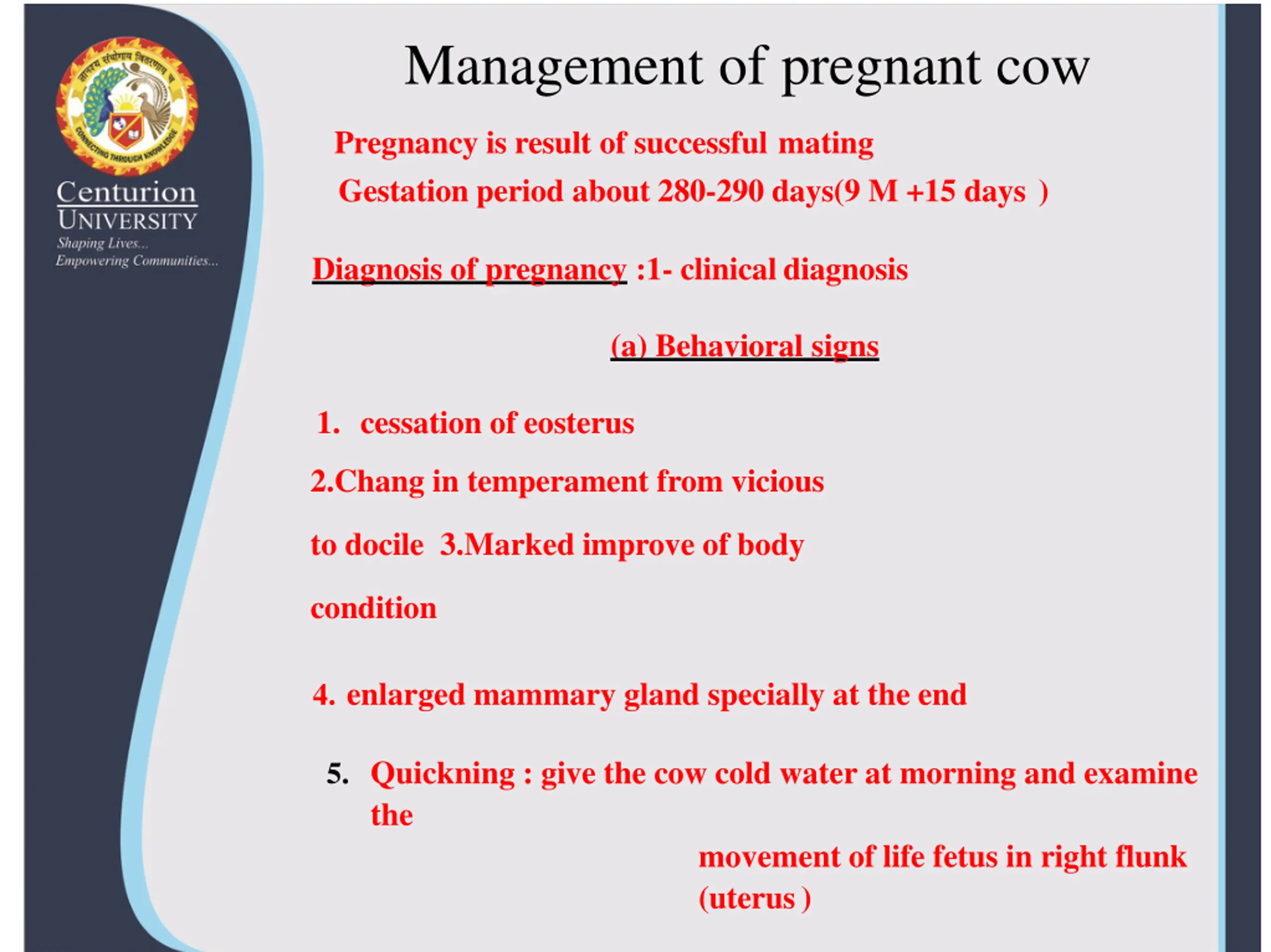 Management of pregnant cow Pregnancy is result of successful mating Gestation period about 280-290 days(9 M +15 days ) Diagnosis of pregnancy :1- clinicaldiagnosis (a) Behavioral signs 1. cessation of eosterus 2.Chang in temperament from vicious to docile 3.Marked improve of body condition 4. enlarged mammary gland specially at the end 5. Quickning : give the cow cold water at morning and examine the movement of life fetus in right flunk (uterus)