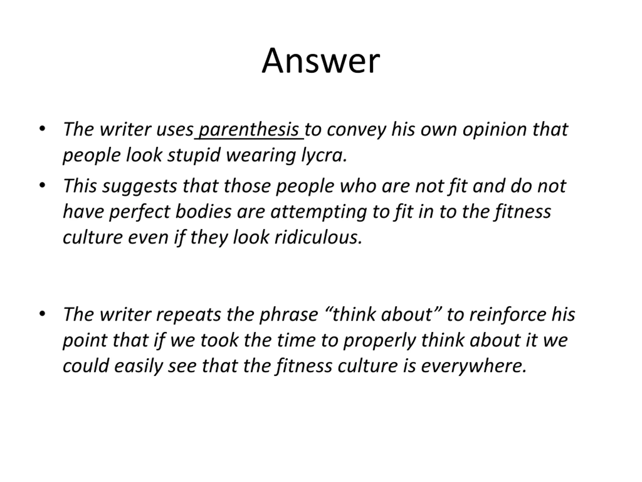 Answer The writer uses parenthesis to convey his own opinion that people look stupid wearing lycra. This suggests that those people who are not fit and do not have perfect bodies are attempting to fit in to the fitness culture even if they look ridiculous. The writer repeats the phrase think about to reinforce his point that if we took the time to properly think about it we could easily see that the fitness culture is everywhere.