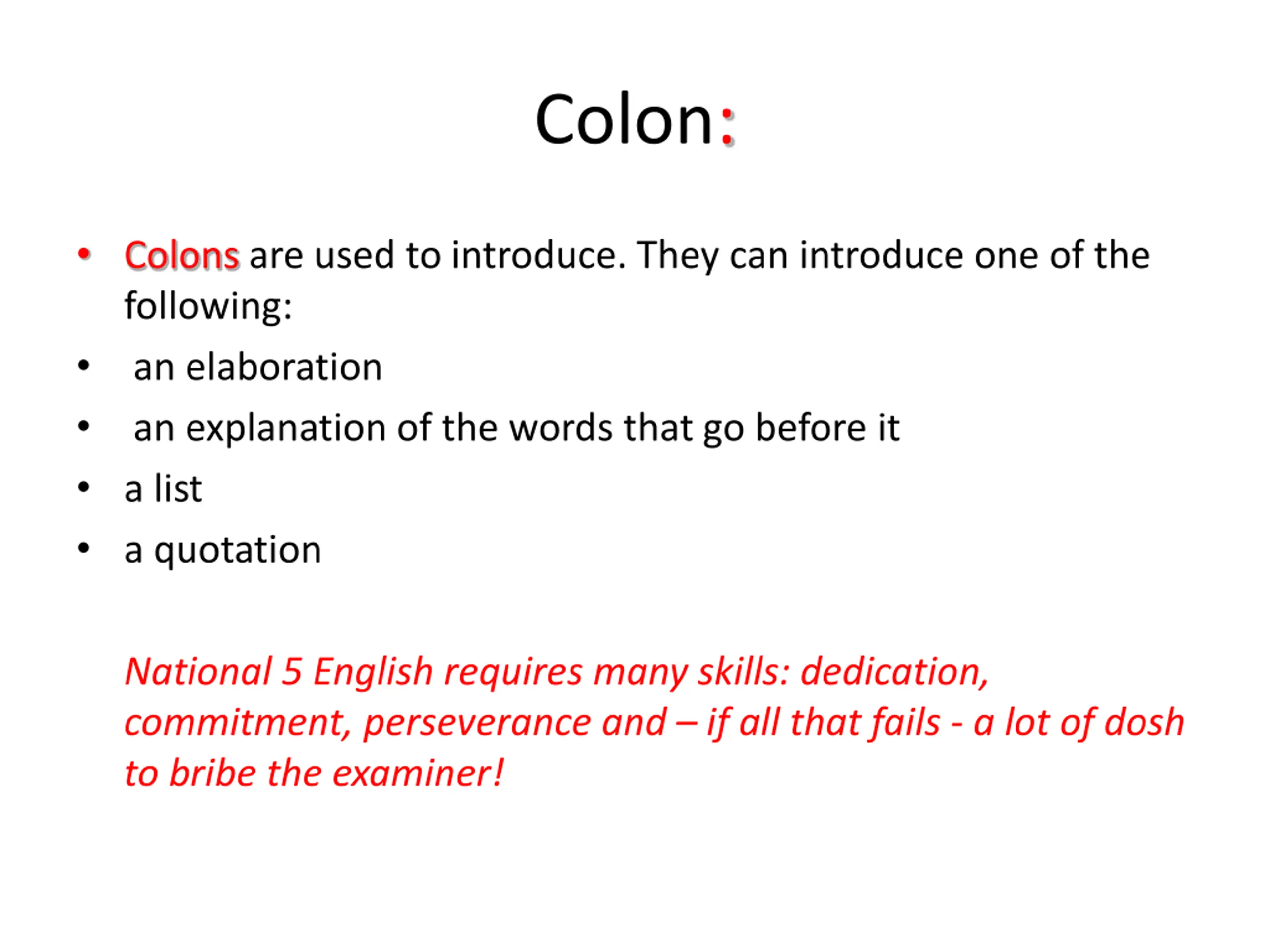 Colon: Colons are used to introduce. They can introduce one of the following: an elaboration an explanation of the words that go before it a list a quotation National 5 English requires many skills: dedication, commitment, perseverance and if all that fails - a lot of dosh to bribe the examiner!