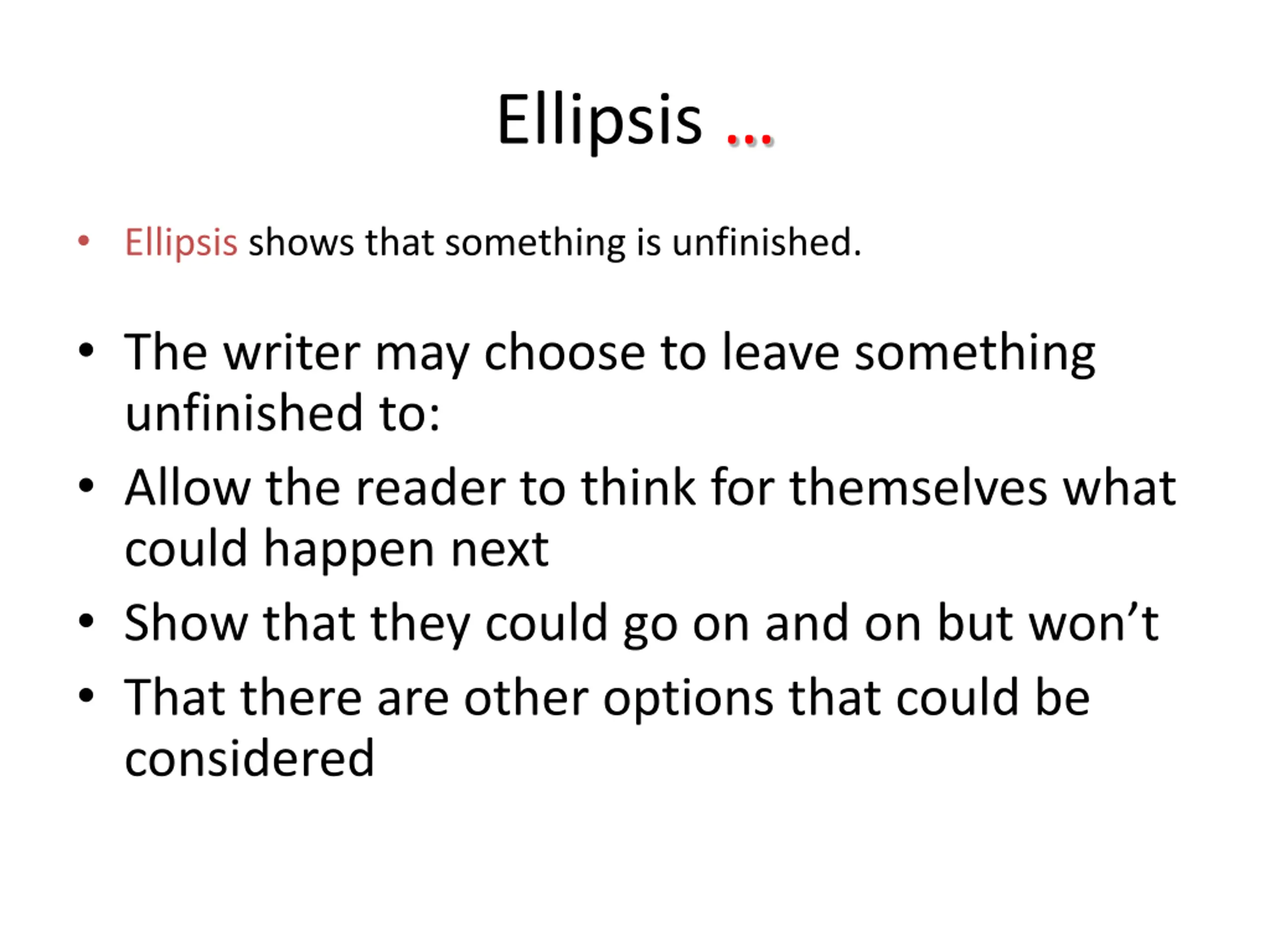 Ellipsis Ellipsis shows that something is unfinished. The writer may choose to leave something unfinished to: Allow the reader to think for themselves what could happen next Show that they could go on and on but won t That there are other options that could be considered