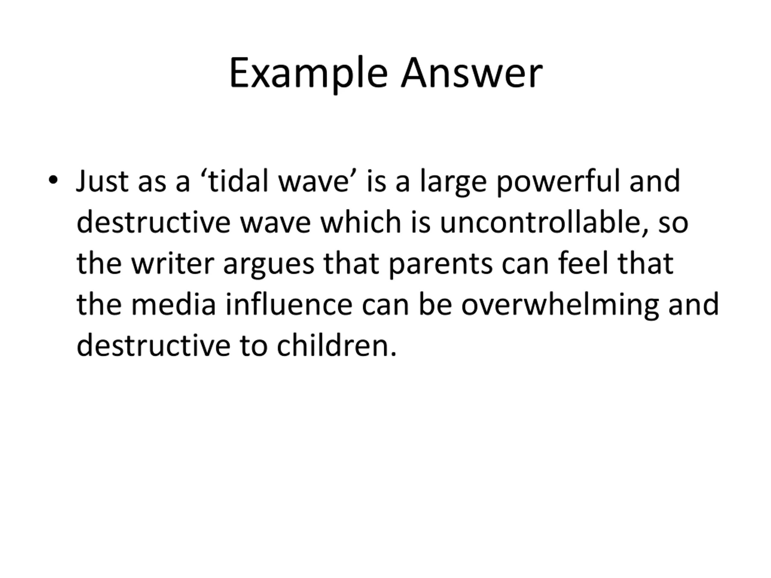 Example Answer Just as a tidal wave is a large powerful and destructive wave which is uncontrollable, so the writer argues that parents can feel that the media influence can be overwhelming and destructive to children.