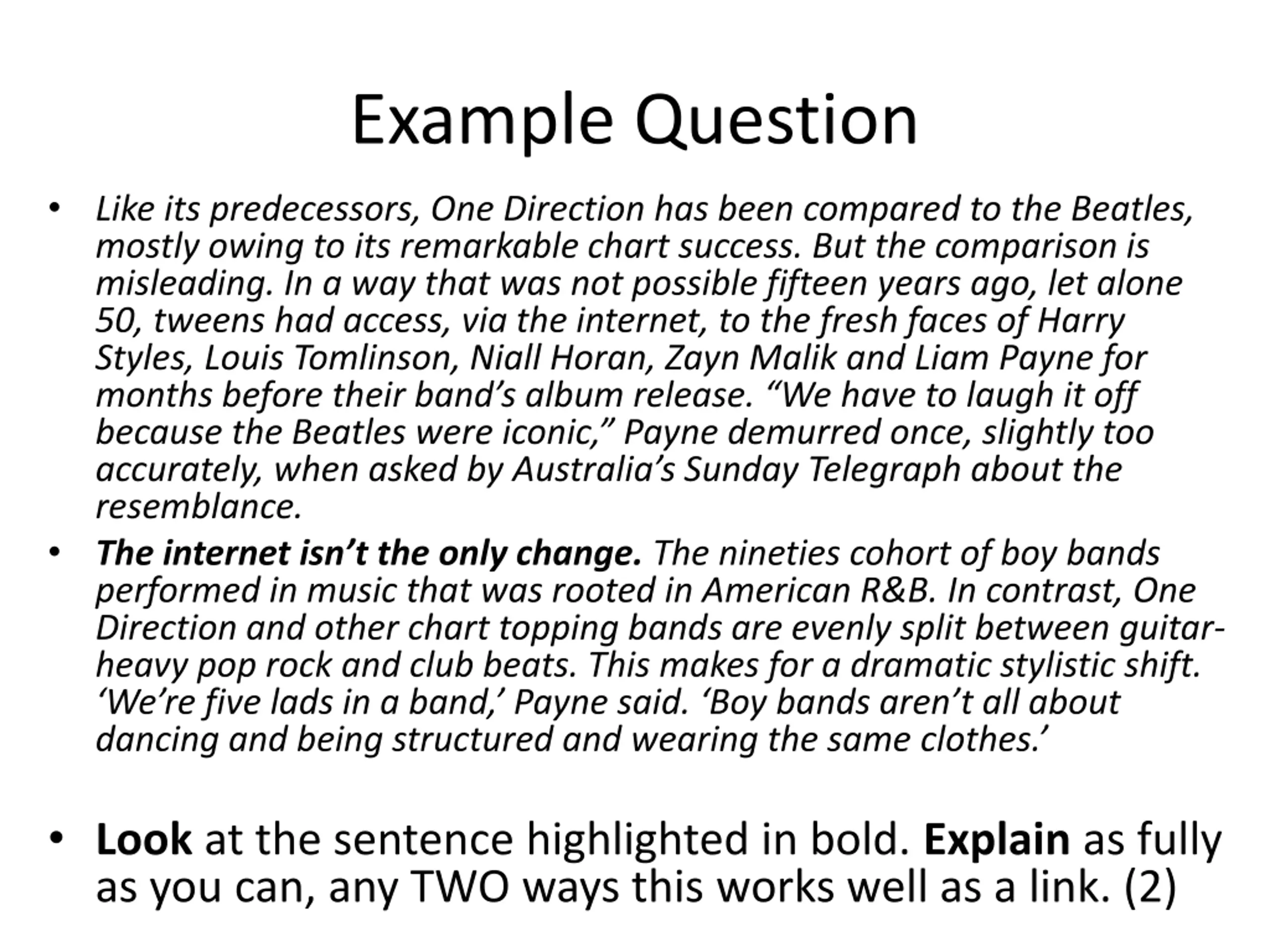 Example Question Like its predecessors, One Direction has been compared to the Beatles, mostly owing to its remarkable chart success. But the comparison is misleading. In a way that was not possible fifteen years ago, let alone 50, tweens had access, via the internet, to the fresh faces of Harry Styles, Louis Tomlinson, Niall Horan, Zayn Malik and Liam Payne for months before their band s album release. We have to laugh it off because the Beatles were iconic, Payne demurred once, slightly too accurately, when asked by Australia s Sunday Telegraph about the resemblance. The internet isn t the only change. The nineties cohort of boy bands performed in music that was rooted in American R&B. In contrast, One Direction and other chart topping bands are evenly split between guitar- heavy pop rock and club beats. This makes for a dramatic stylistic shift. We re five lads in a band, Payne said. Boy bands aren t all about dancing and being structured and wearing the same clothes. Look at the sentence highlighted in bold. Explain as fully as you can, any TWO ways this works well as a link. (2)