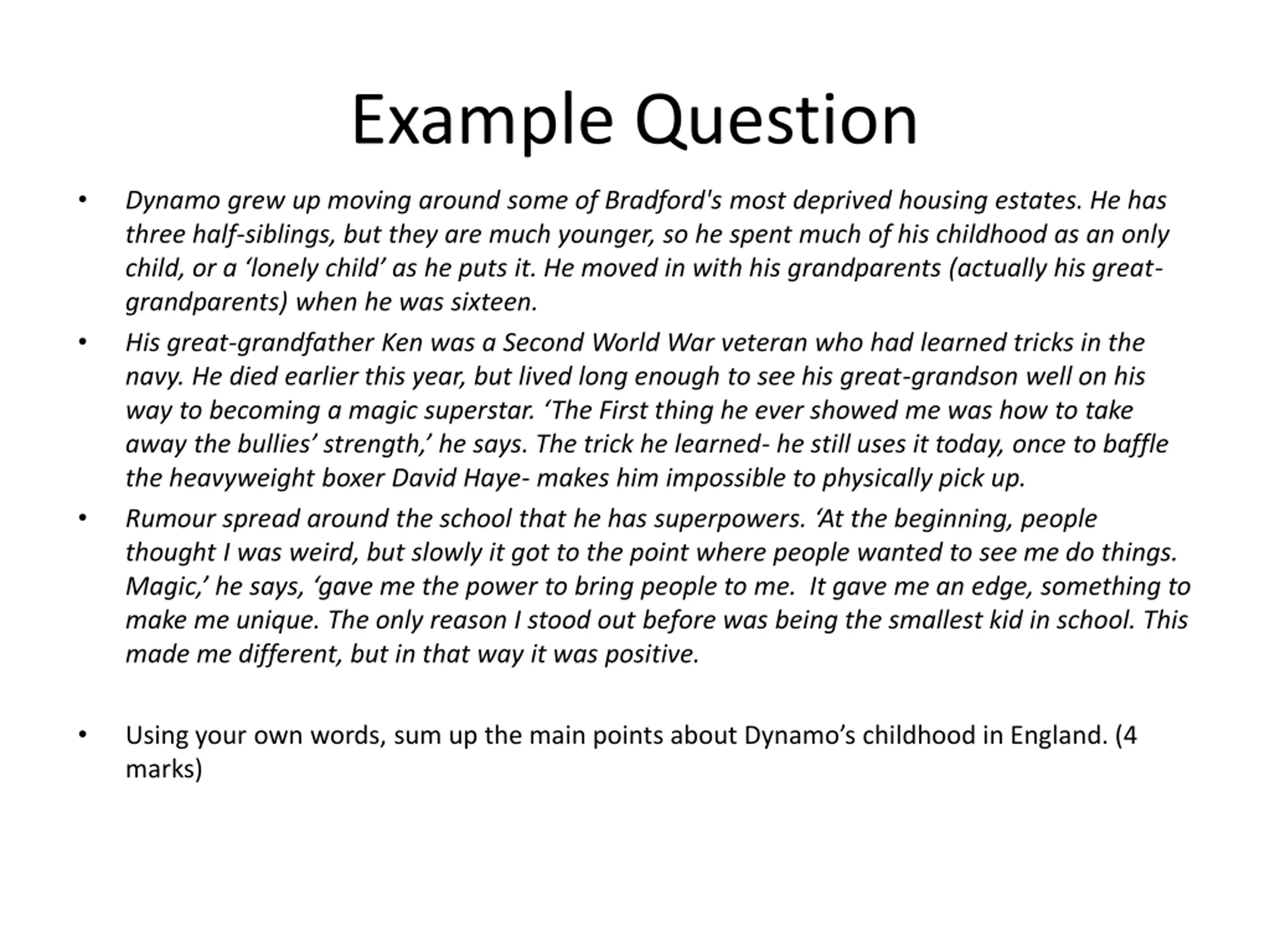 Example Question Dynamo grew up moving around some of Bradford's most deprived housing estates. He has three half-siblings, but they are much younger, so he spent much of his childhood as an only child, or a lonely child as he puts it. He moved in with his grandparents (actually his great- grandparents) when he was sixteen. His great-grandfather Ken was a Second World War veteran who had learned tricks in the navy. He died earlier this year, but lived long enough to see his great-grandson well on his way to becoming a magic superstar. The First thing he ever showed me was how to take away the bullies strength, he says. The trick he learned- he still uses it today, once to baffle the heavyweight boxer David Haye- makes him impossible to physically pick up. Rumour spread around the school that he has superpowers. At the beginning, people thought I was weird, but slowly it got to the point where people wanted to see me do things. Magic, he says, gave me the power to bring people to me. It gave me an edge, something to make me unique. The only reason I stood out before was being the smallest kid in school. This made me different, but in that way it was positive. Using your own words, sum up the main points about Dynamo s childhood in England. (4 marks)