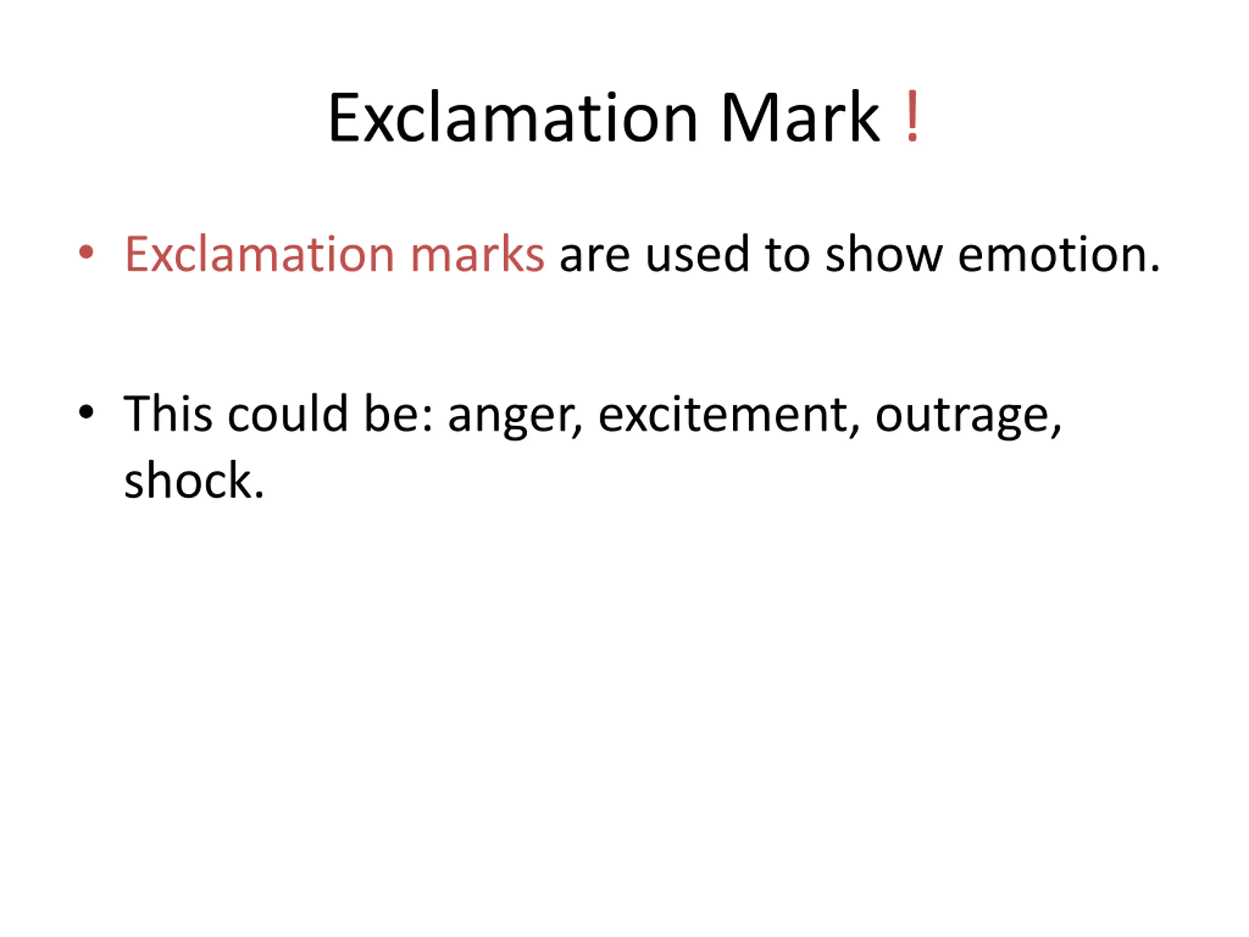 Exclamation Mark ! Exclamation marks are used to show emotion. This could be: anger, excitement, outrage, shock.