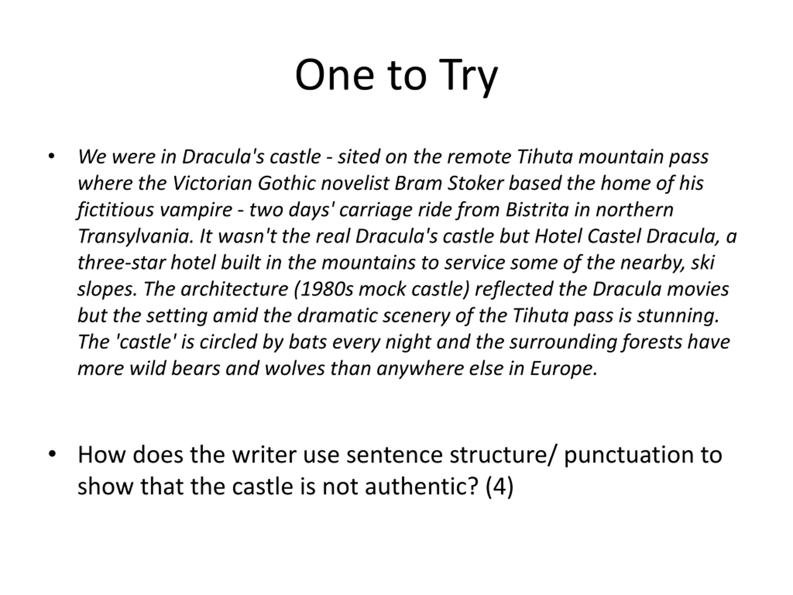 One to Try We were in Dracula's castle - sited on the remote Tihuta mountain pass where the Victorian Gothic novelist Bram Stoker based the home of his fictitious vampire - two days' carriage ride from Bistrita in northern Transylvania. It wasn't the real Dracula's castle but Hotel Castel Dracula, a three-star hotel built in the mountains to service some of the nearby, ski slopes. The architecture (1980s mock castle) reflected the Dracula movies but the setting amid the dramatic scenery of the Tihuta pass is stunning. The 'castle' is circled by bats every night and the surrounding forests have more wild bears and wolves than anywhere else in Europe. How does the writer use sentence structure/ punctuation to show that the castle is not authentic? (4)
