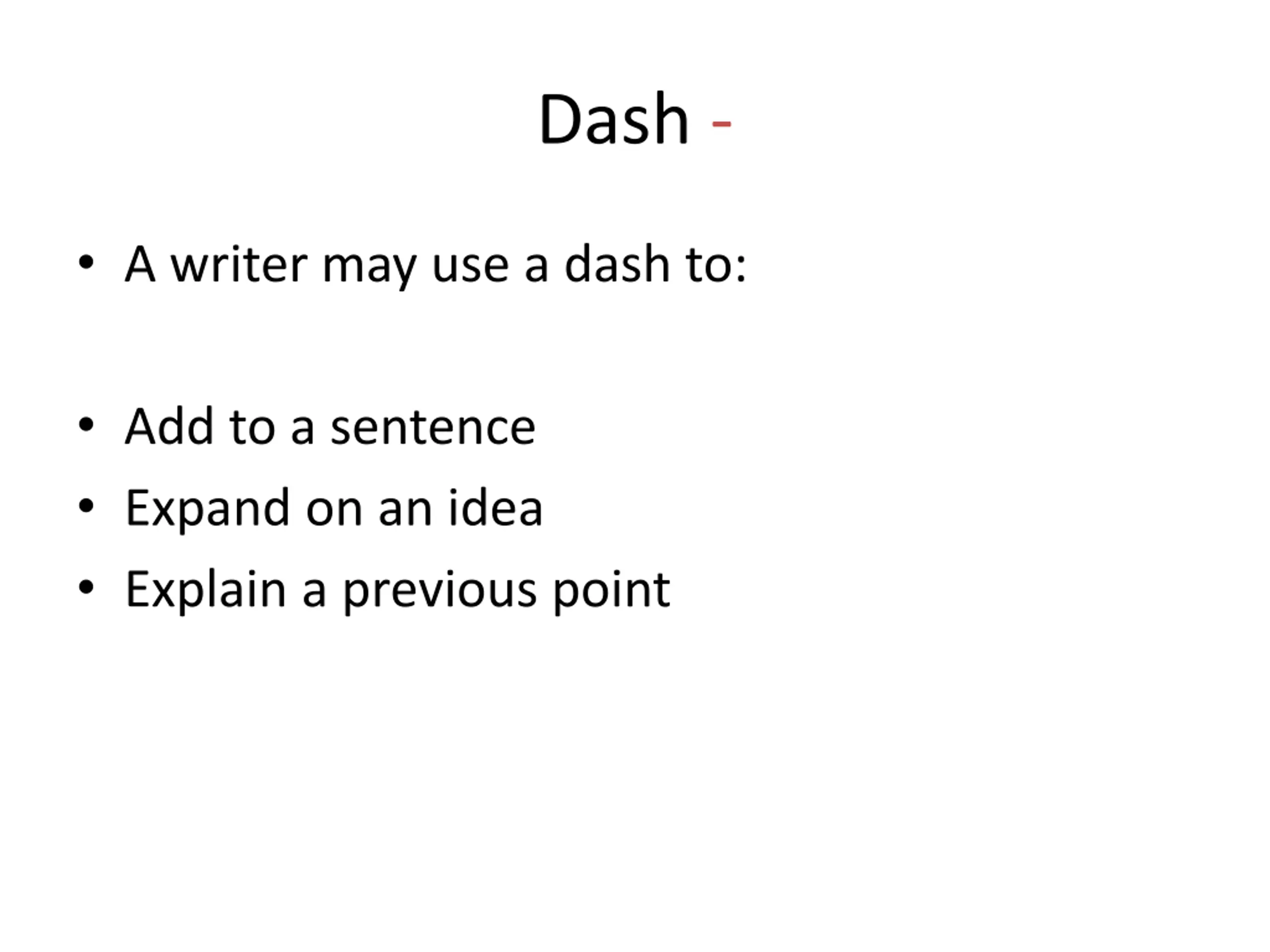 Dash - A writer may use a dash to: Add to a sentence Expand on an idea Explain a previous point