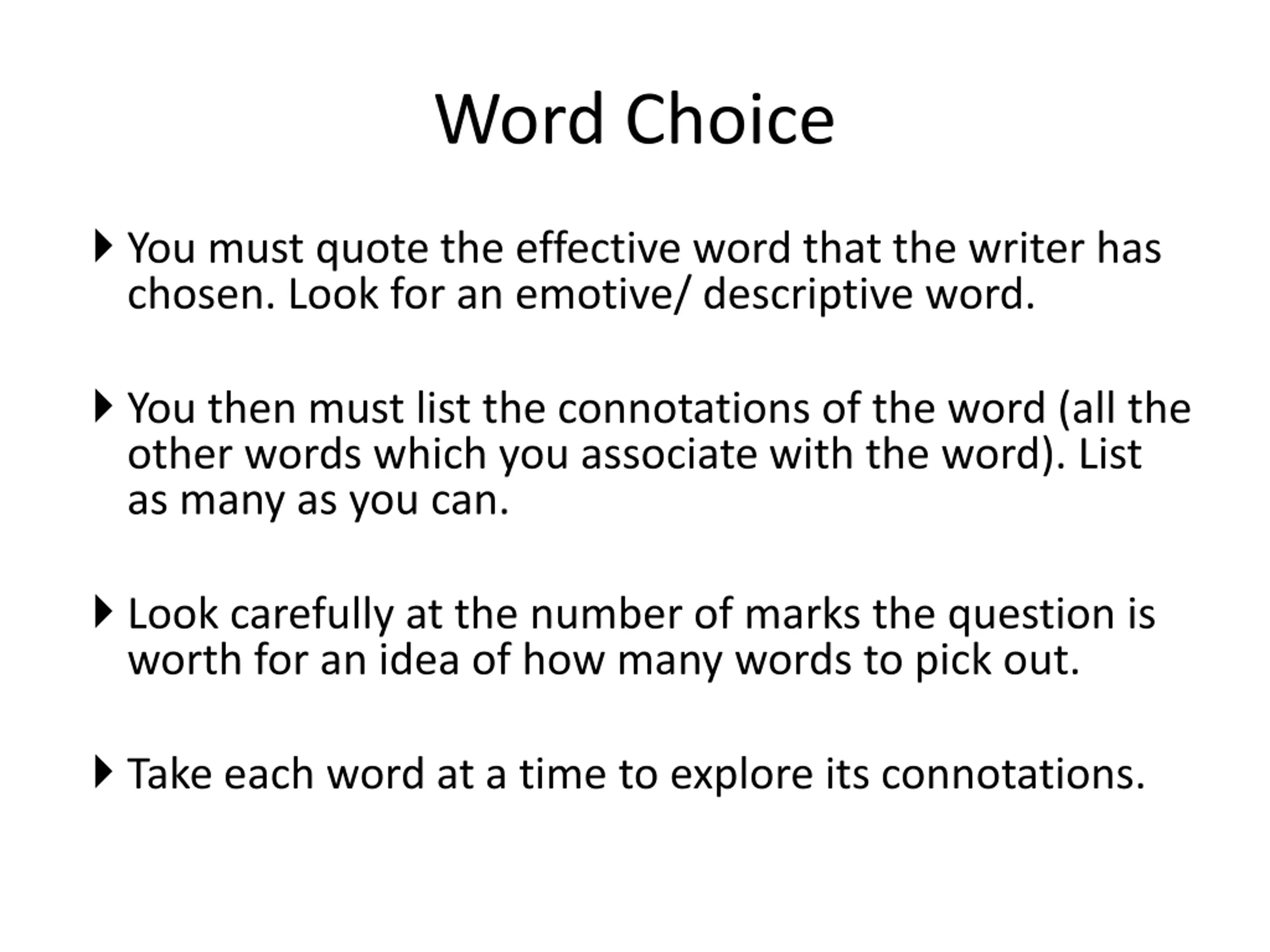 Word Choice You must quote the effective word that the writer has chosen. Look for an emotive/ descriptive word. You then must list the connotations of the word (all the other words which you associate with the word). List as many as you can. Look carefully at the number of marks the question is worth for an idea of how many words to pick out. Take each word at a time to explore its connotations.