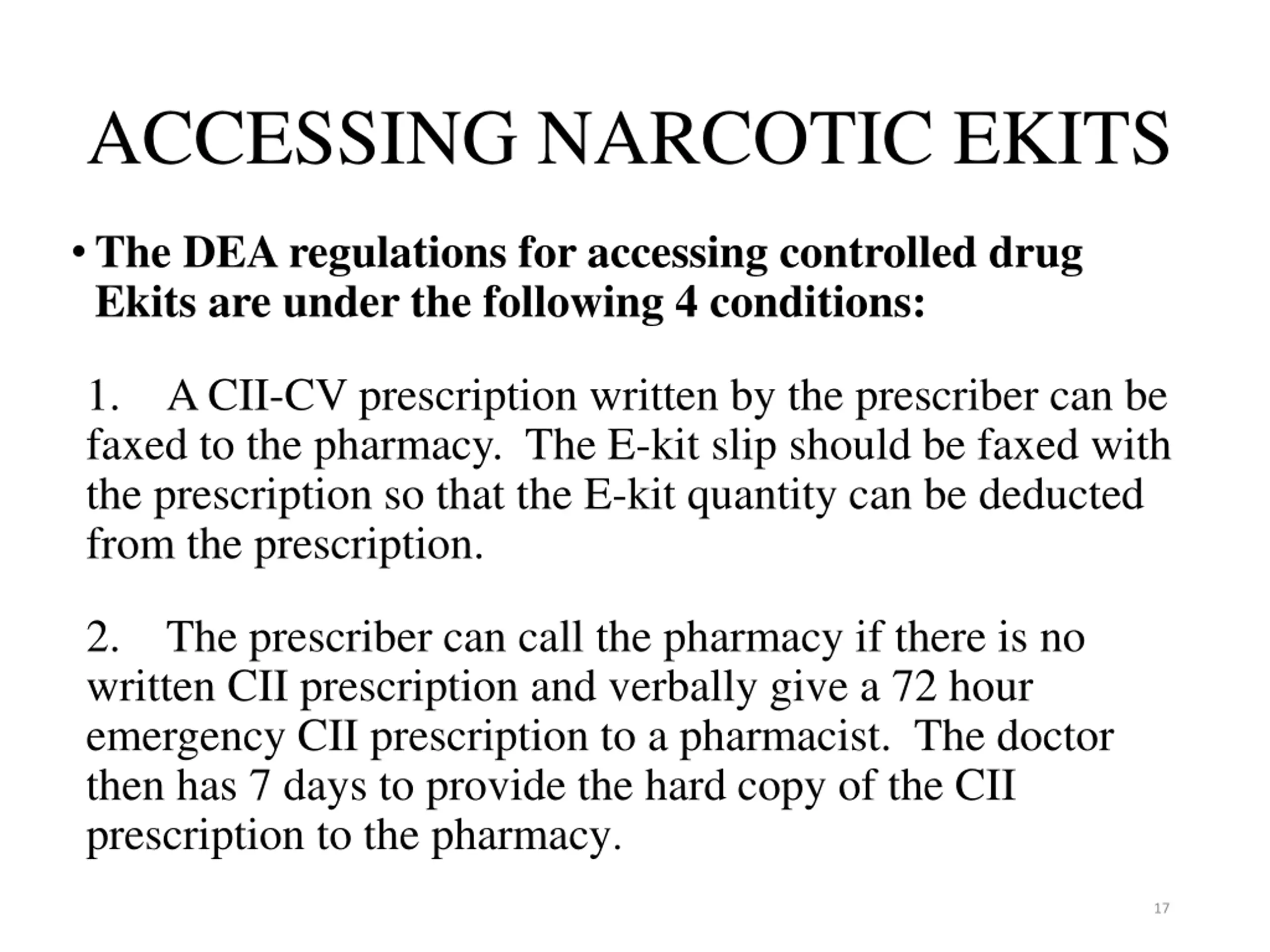 ACCESSING NARCOTIC EKITS The DEA regulations for accessing controlled drug Ekits are under the following 4 conditions: 1. A CII-CV prescription written by the prescriber can be faxed to the pharmacy. The E-kit slip should be faxed with the prescription so that the E-kit quantity can be deducted from the prescription. 2. The prescriber can call the pharmacy if there is no written CII prescription and verbally give a 72 hour emergency CII prescription to a pharmacist. The doctor then has 7 days to provide the hard copy of the CII prescription to the pharmacy. 17