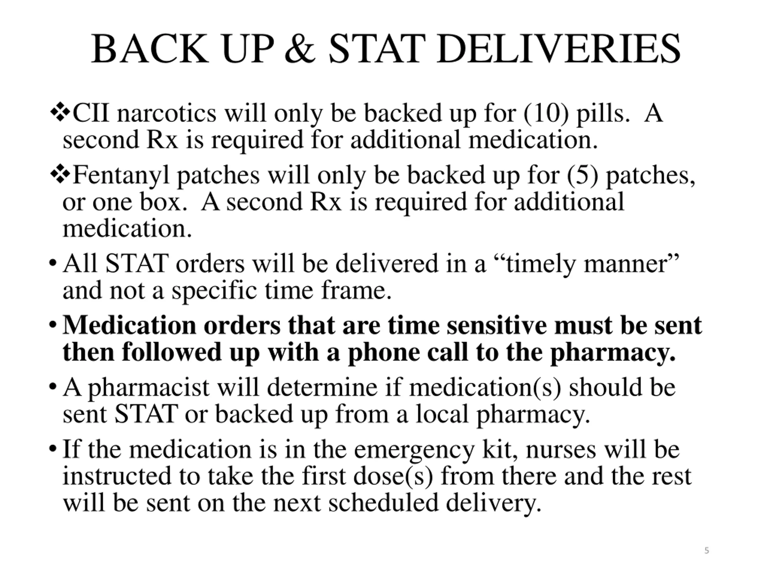 BACK UP & STAT DELIVERIES CII narcotics will only be backed up for (10) pills. A second Rx is required for additional medication. Fentanyl patches will only be backed up for (5) patches, or one box. A second Rx is required for additional medication. All STAT orders will be delivered in a timely manner and not a specific time frame. Medication orders that are time sensitive must be sent then followed up with a phone call to the pharmacy. A pharmacist will determine if medication(s) should be sent STAT or backed up from a local pharmacy. If the medication is in the emergency kit, nurses will be instructed to take the first dose(s) from there and the rest will be sent on the next scheduled delivery. 5