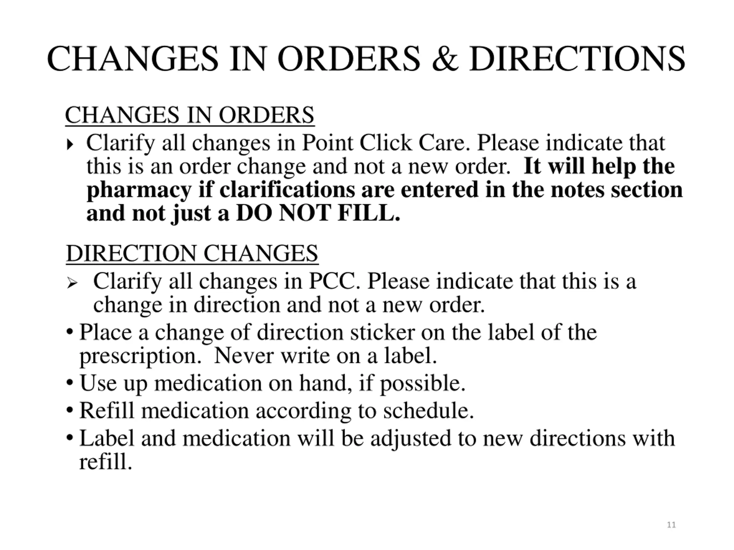 CHANGES IN ORDERS & DIRECTIONS CHANGES IN ORDERS Clarify all changes in Point Click Care. Please indicate that this is an order change and not a new order. It will help the pharmacy if clarifications are entered in the notes section and not just a DO NOT FILL. DIRECTION CHANGES Clarify all changes in PCC. Please indicate that this is a change in direction and not a new order. Place a change of direction sticker on the label of the prescription. Never write on a label. Use up medication on hand, if possible. Refill medication according to schedule. Label and medication will be adjusted to new directions with refill. 11