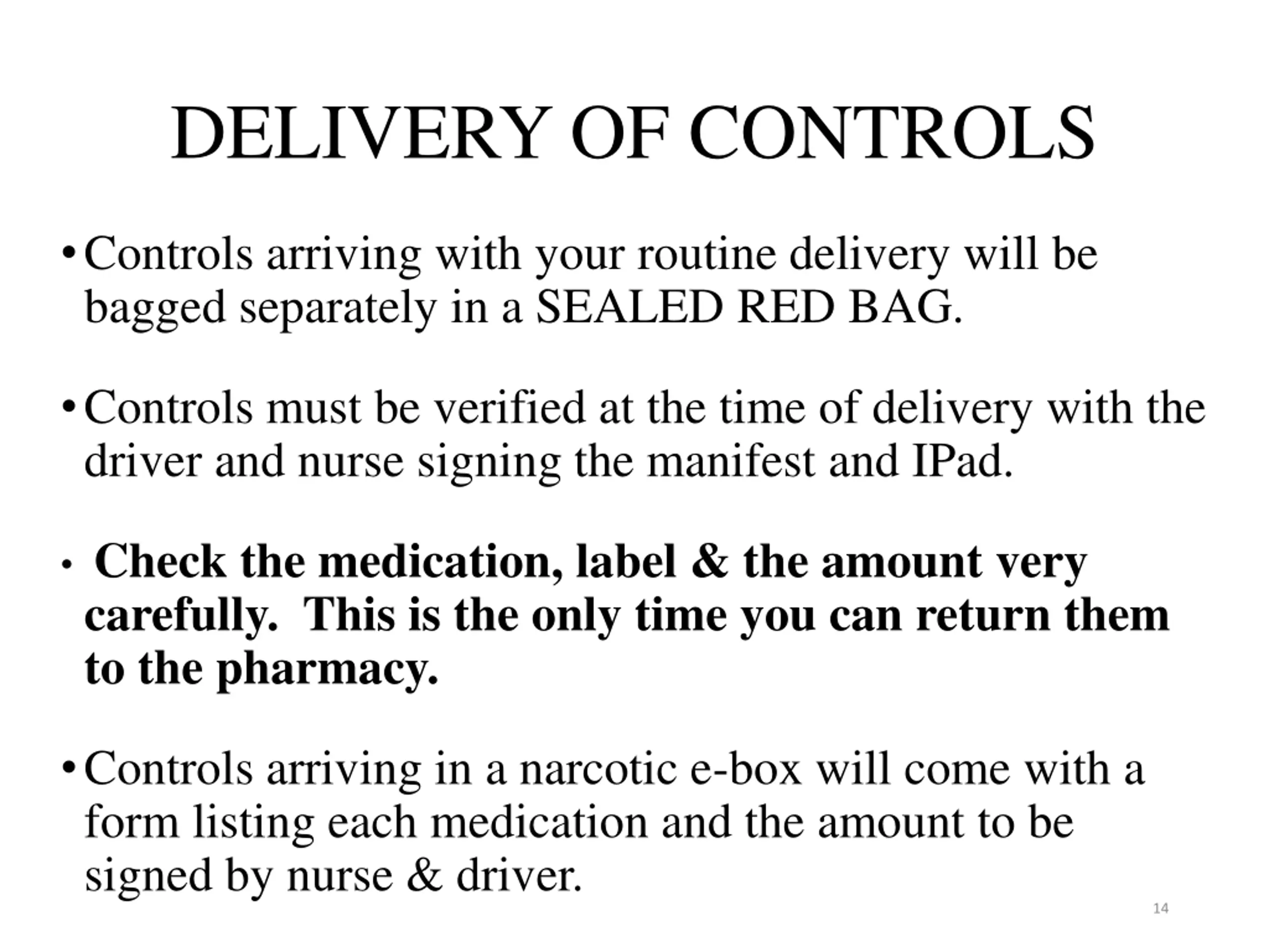 DELIVERY OF CONTROLS Controls arriving with your routine delivery will be bagged separately in a SEALED RED BAG. Controls must be verified at the time of delivery with the driver and nurse signing the manifest and IPad. Check the medication, label & the amount very carefully. This is the only time you can return them to the pharmacy. Controls arriving in a narcotic e-box will come with a form listing each medication and the amount to be signed by nurse & driver. 14