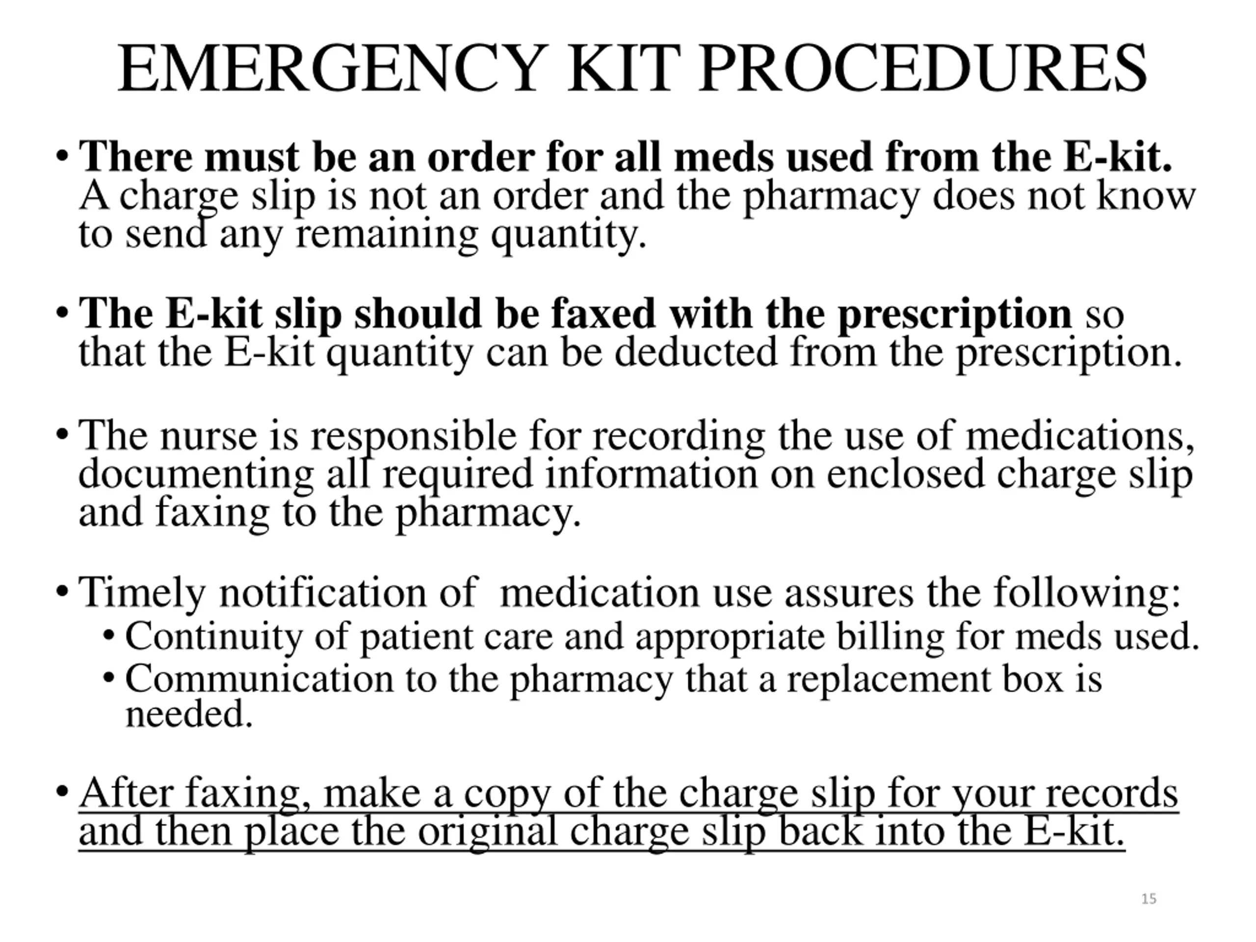 EMERGENCY KIT PROCEDURES There must be an order for all meds used from the E-kit. A charge slip is not an order and the pharmacy does not know to send any remaining quantity. The E-kit slip should be faxed with the prescription so that the E-kit quantity can be deducted from the prescription. The nurse is responsible for recording the use of medications, documenting all required information on enclosed charge slip and faxing to the pharmacy. Timely notification of medication use assures the following: Continuity of patient care and appropriate billing for meds used. Communication to the pharmacy that a replacement box is needed. After faxing, make a copy of the charge slip for your records and then place the original charge slip back into the E-kit. 15