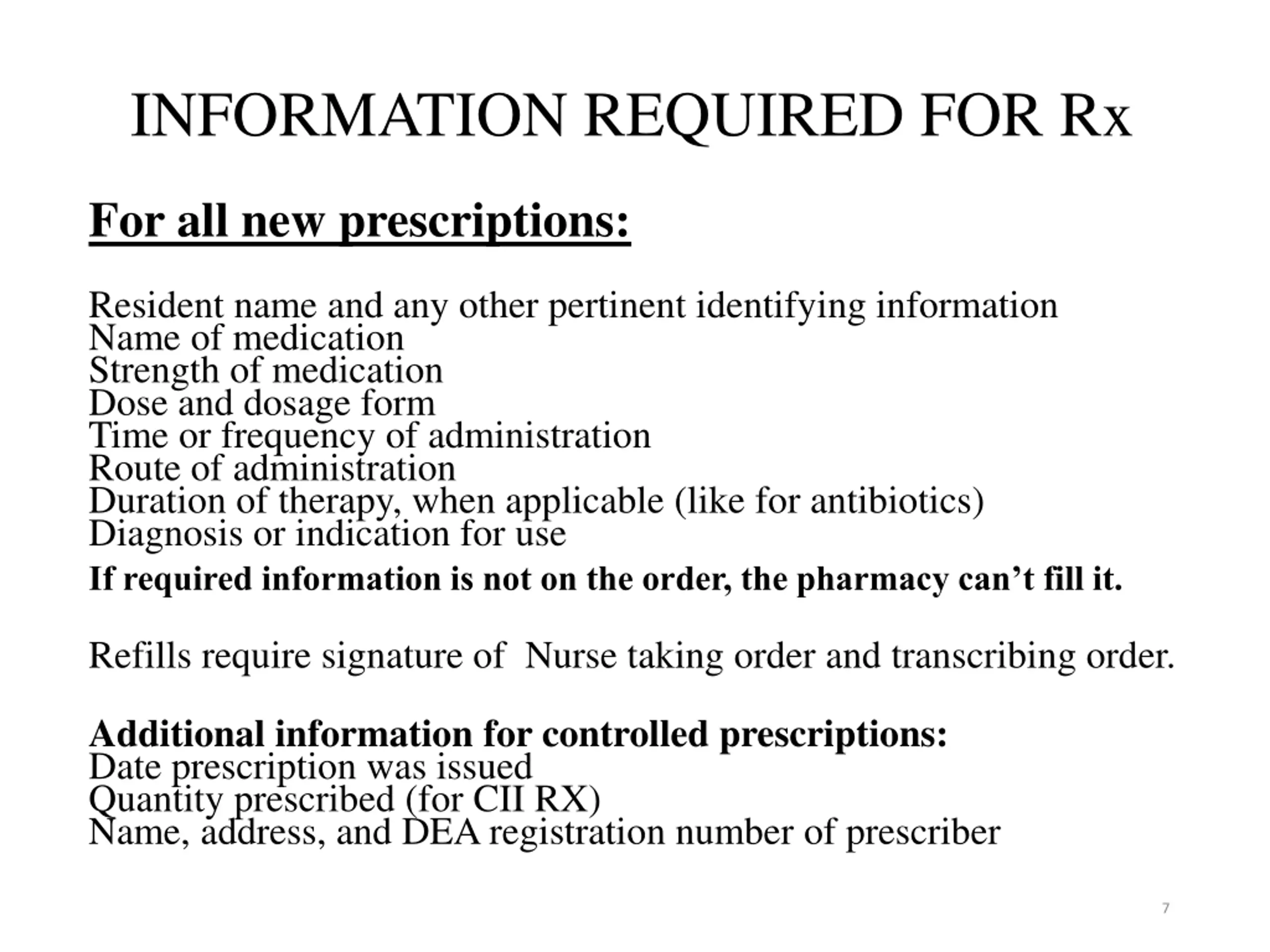 INFORMATION REQUIRED FOR Rx For all new prescriptions: Resident name and any other pertinent identifying information Name of medication Strength of medication Dose and dosage form Time or frequency of administration Route of administration Duration of therapy, when applicable (like for antibiotics) Diagnosis or indication for use If required information is not on the order, the pharmacy can t fill it. Refills require signature of Nurse taking order and transcribing order. Additional information for controlled prescriptions: Date prescription was issued Quantity prescribed (for CII RX) Name, address, and DEA registration number of prescriber 7