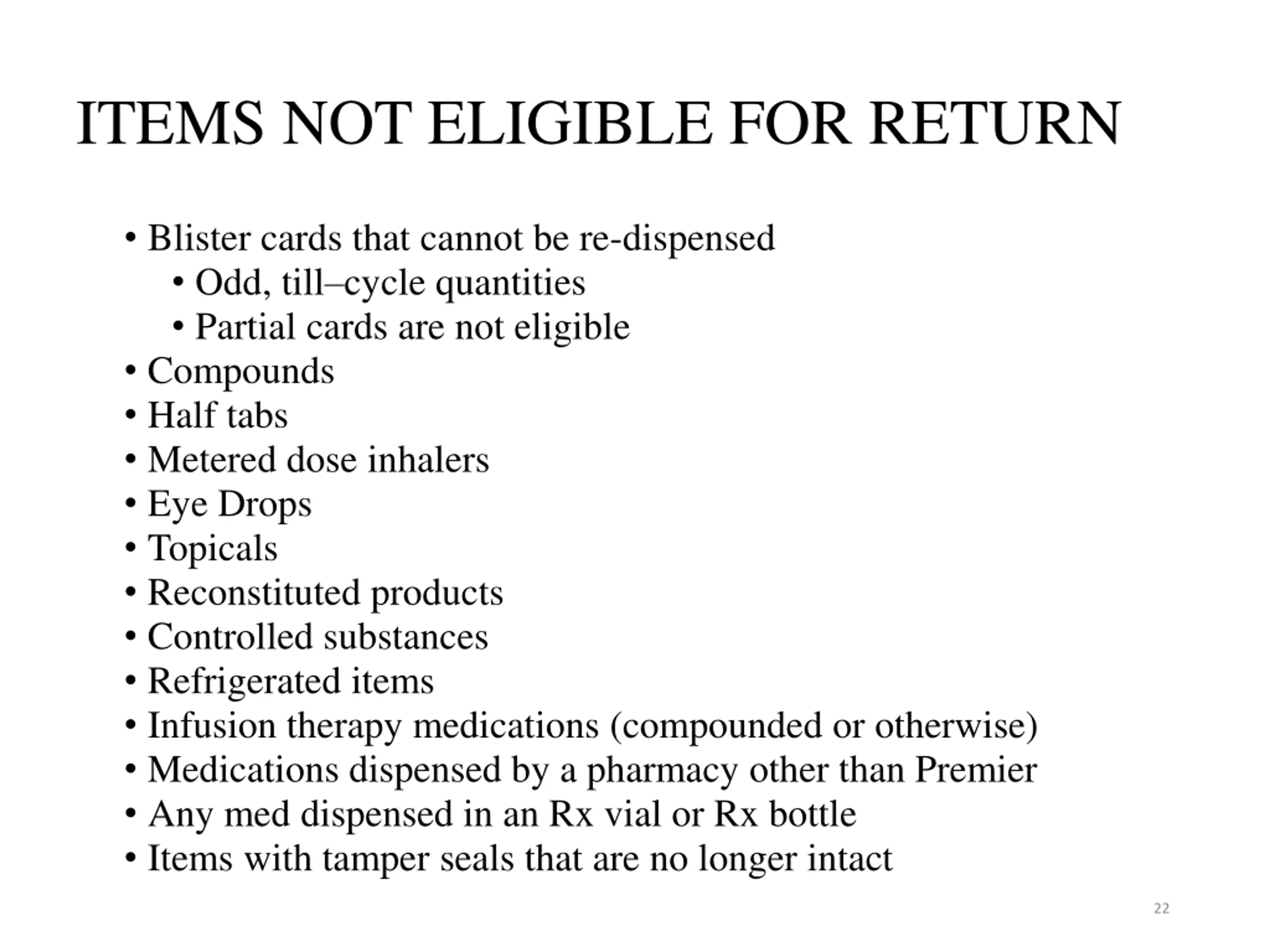 ITEMS NOT ELIGIBLE FOR RETURN Blister cards that cannot be re-dispensed Odd, till cycle quantities Partial cards are not eligible Compounds Half tabs Metered dose inhalers Eye Drops Topicals Reconstituted products Controlled substances Refrigerated items Infusion therapy medications (compounded or otherwise) Medications dispensed by a pharmacy other than Premier Any med dispensed in an Rx vial or Rx bottle Items with tamper seals that are no longer intact 22