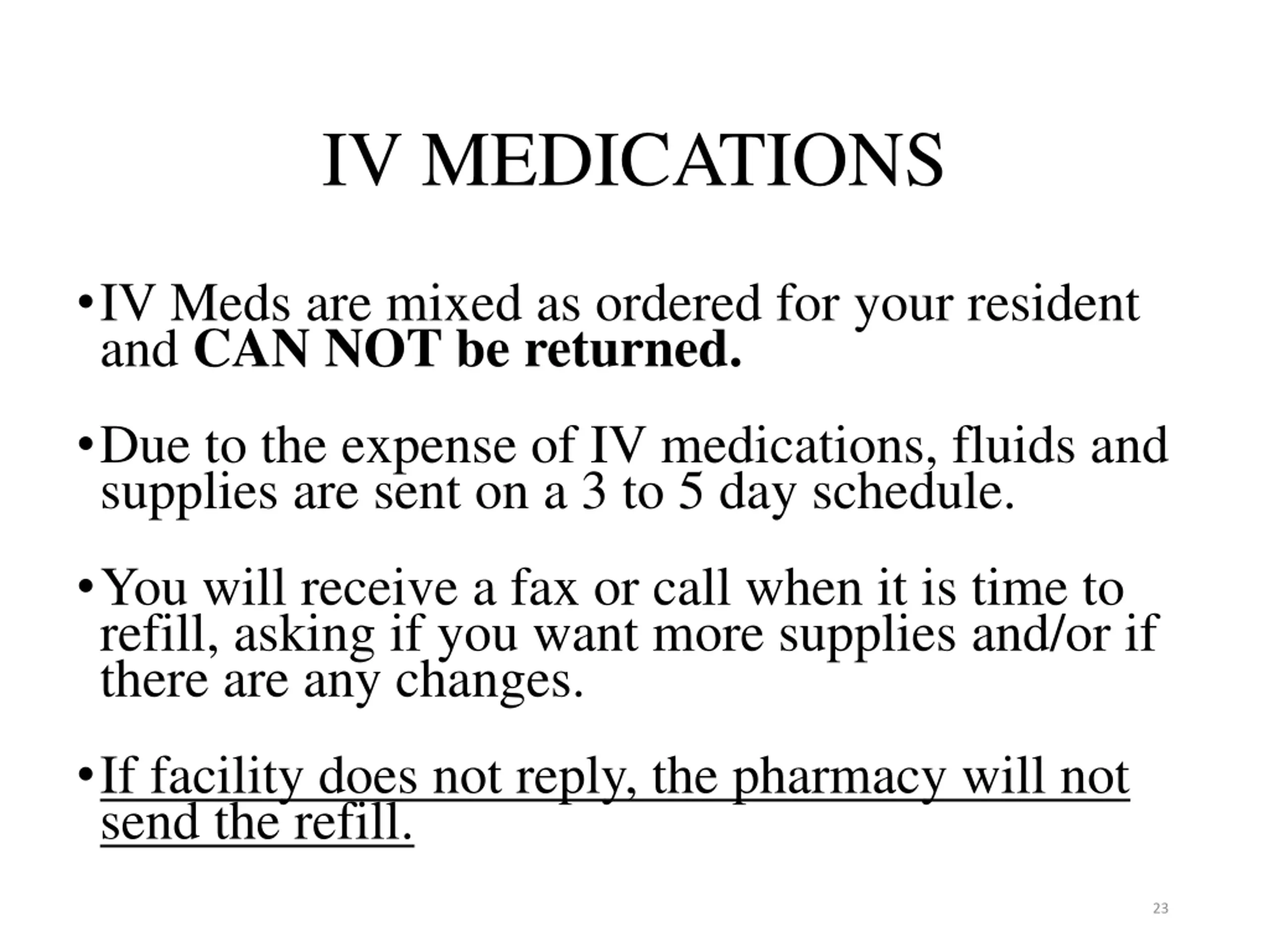 IV MEDICATIONS IV Meds are mixed as ordered for your resident and CAN NOT be returned. Due to the expense of IV medications, fluids and supplies are sent on a 3 to 5 day schedule. You will receive a fax or call when it is time to refill, asking if you want more supplies and/or if there are any changes. If facility does not reply, the pharmacy will not send the refill. 23