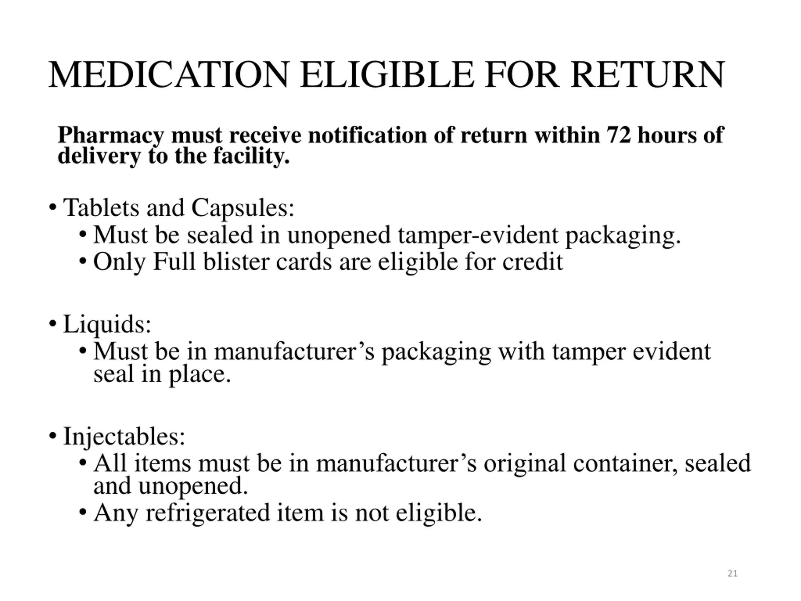 MEDICATION ELIGIBLE FOR RETURN Pharmacy must receive notification of return within 72 hours of delivery to the facility. Tablets and Capsules: Must be sealed in unopened tamper-evident packaging. Only Full blister cards are eligible for credit Liquids: Must be in manufacturer s packaging with tamper evident seal in place. Injectables: All items must be in manufacturer s original container, sealed and unopened. Any refrigerated item is not eligible. 21