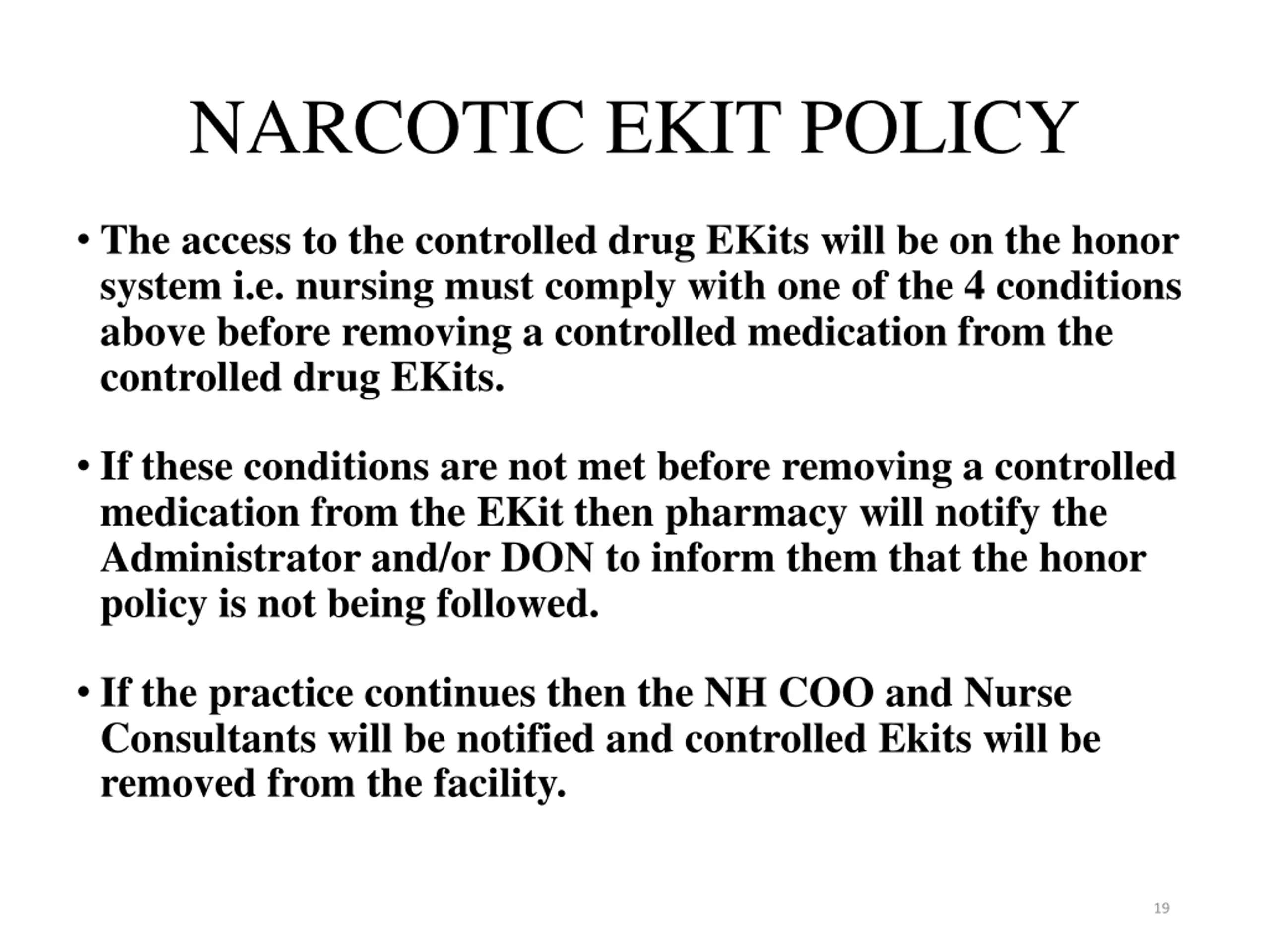 NARCOTIC EKIT POLICY The access to the controlled drug EKits will be on the honor system i.e. nursing must comply with one of the 4 conditions above before removing a controlled medication from the controlled drug EKits. If these conditions are not met before removing a controlled medication from the EKit then pharmacy will notify the Administrator and/or DON to inform them that the honor policy is not being followed. If the practice continues then the NH COO and Nurse Consultants will be notified and controlled Ekits will be removed from the facility. 19