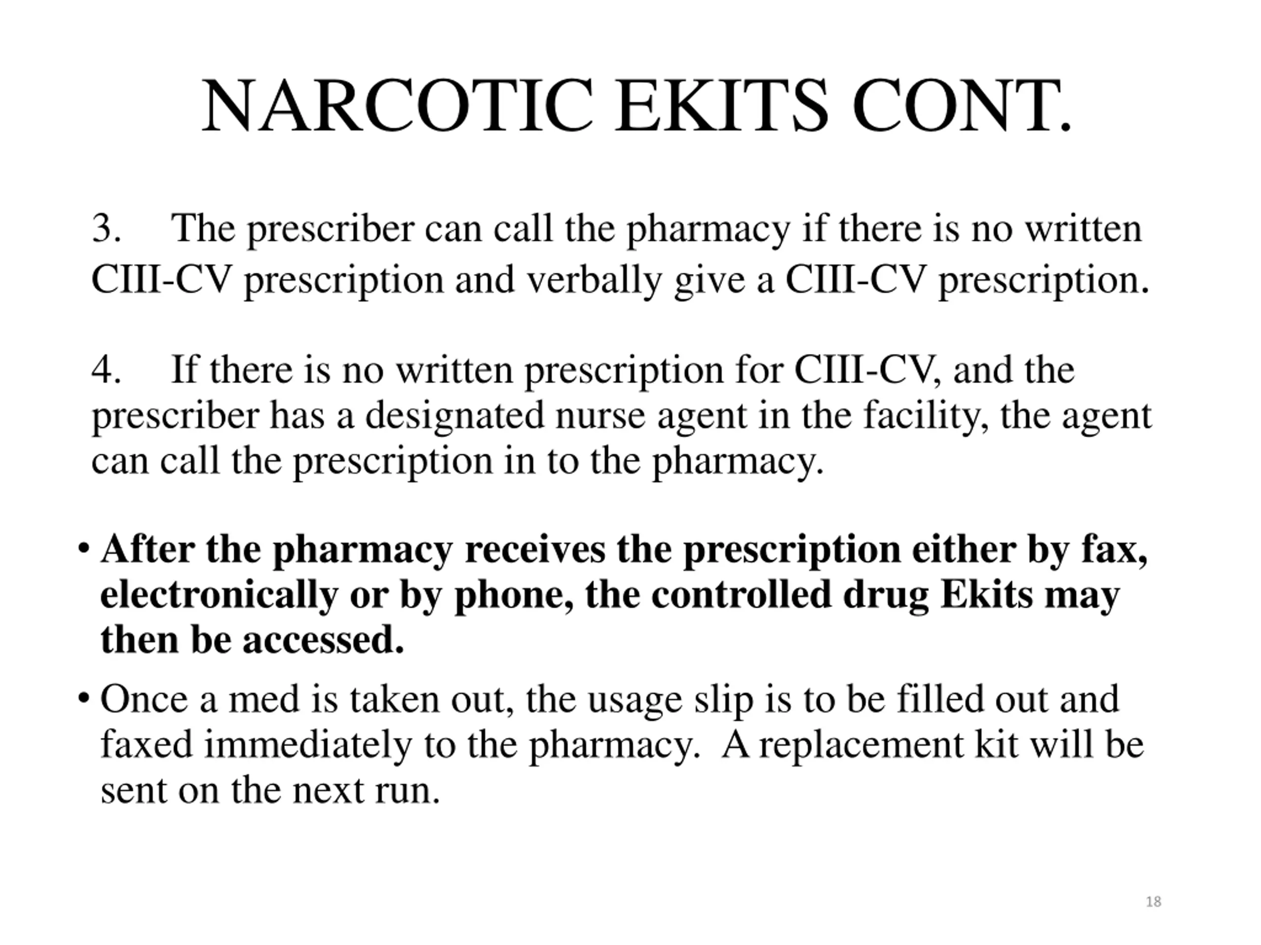 NARCOTIC EKITS CONT. 3. The prescriber can call the pharmacy if there is no written CIII-CV prescription and verbally give a CIII-CV prescription. 4. If there is no written prescription for CIII-CV, and the prescriber has a designated nurse agent in the facility, the agent can call the prescription in to the pharmacy. After the pharmacy receives the prescription either by fax, electronically or by phone, the controlled drug Ekits may then be accessed. Once a med is taken out, the usage slip is to be filled out and faxed immediately to the pharmacy. A replacement kit will be sent on the next run. 18