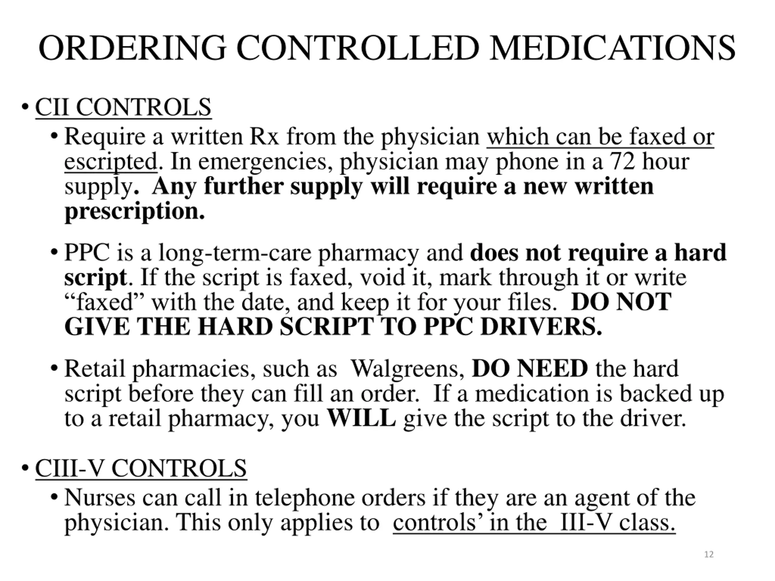 ORDERING CONTROLLED MEDICATIONS CII CONTROLS Require a written Rx from the physician which can be faxed or escripted. In emergencies, physician may phone in a 72 hour supply. Any further supply will require a new written prescription. PPC is a long-term-care pharmacy and does not require a hard script. If the script is faxed, void it, mark through it or write faxed with the date, and keep it for your files. DO NOT GIVE THE HARD SCRIPT TO PPC DRIVERS. Retail pharmacies, such as Walgreens, DO NEED the hard script before they can fill an order. If a medication is backed up to a retail pharmacy, you WILL give the script to the driver. CIII-V CONTROLS Nurses can call in telephone orders if they are an agent of the physician. This only applies to controls in the III-V class. 12