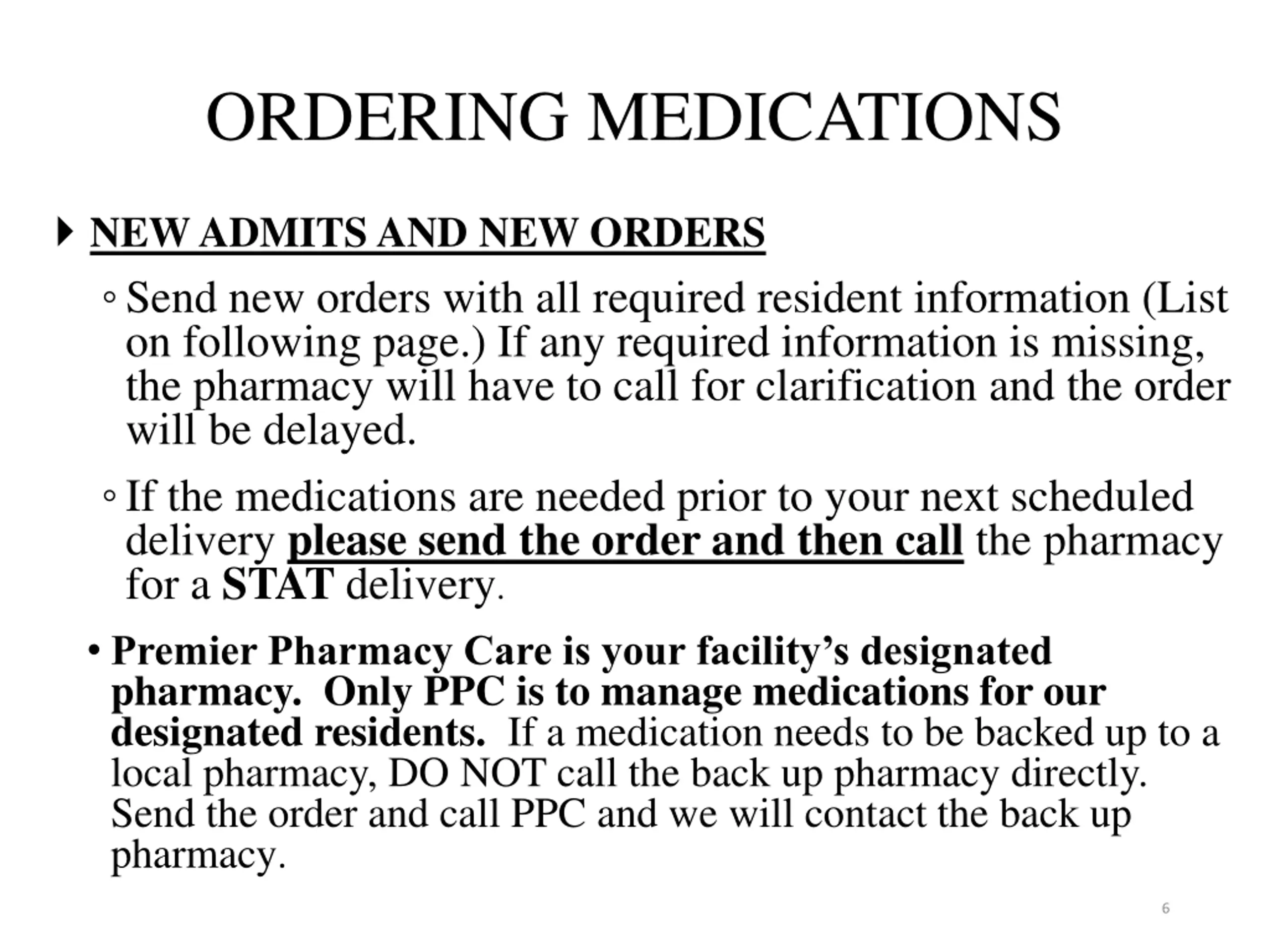ORDERING MEDICATIONS NEW ADMITS AND NEW ORDERS Send new orders with all required resident information (List on following page.) If any required information is missing, the pharmacy will have to call for clarification and the order will be delayed. If the medications are needed prior to your next scheduled delivery please send the order and then call the pharmacy for a STAT delivery. Premier Pharmacy Care is your facility s designated pharmacy. Only PPC is to manage medications for our designated residents. If a medication needs to be backed up to a local pharmacy, DO NOT call the back up pharmacy directly. Send the order and call PPC and we will contact the back up pharmacy. 6