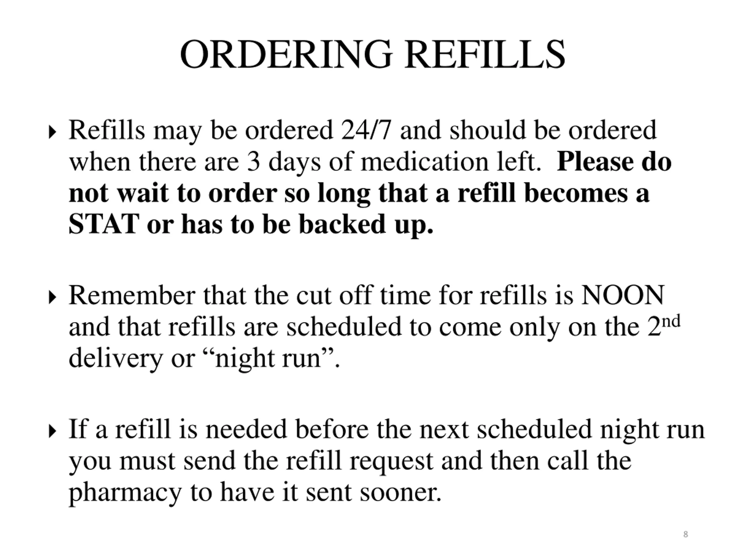 ORDERING REFILLS Refills may be ordered 24/7 and should be ordered when there are 3 days of medication left. Please do not wait to order so long that a refill becomes a STAT or has to be backed up. Remember that the cut off time for refills is NOON and that refills are scheduled to come only on the 2nd delivery or night run . If a refill is needed before the next scheduled night run you must send the refill request and then call the pharmacy to have it sent sooner. 8