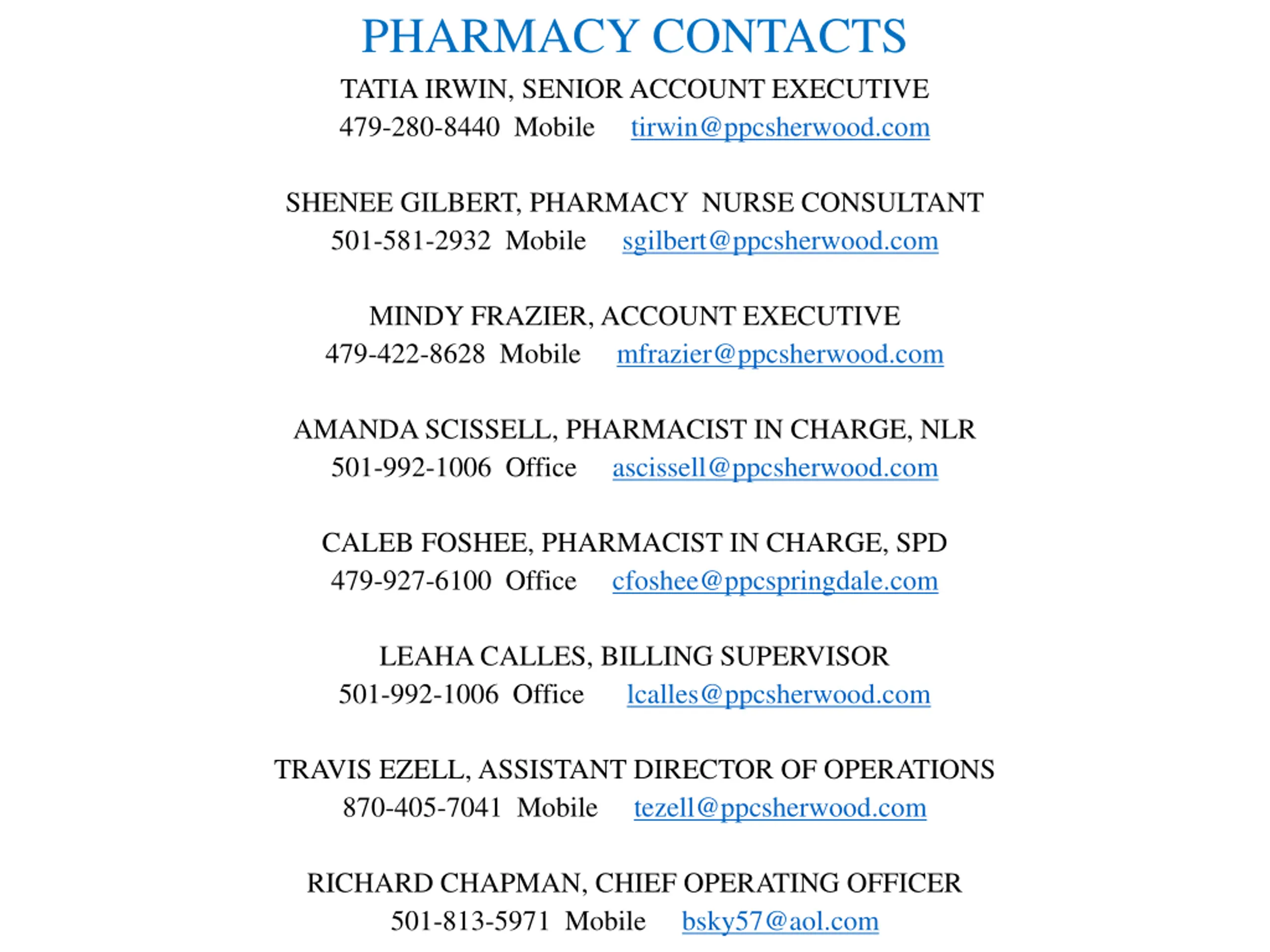 PHARMACY CONTACTS TATIA IRWIN, SENIOR ACCOUNT EXECUTIVE 479-280-8440 Mobile tirwin@ppcsherwood.com SHENEE GILBERT, PHARMACY NURSE CONSULTANT 501-581-2932 Mobile sgilbert@ppcsherwood.com MINDY FRAZIER, ACCOUNT EXECUTIVE 479-422-8628 Mobile mfrazier@ppcsherwood.com AMANDA SCISSELL, PHARMACIST IN CHARGE, NLR 501-992-1006 Office ascissell@ppcsherwood.com CALEB FOSHEE, PHARMACIST IN CHARGE, SPD 479-927-6100 Office cfoshee@ppcspringdale.com LEAHA CALLES, BILLING SUPERVISOR 501-992-1006 Office lcalles@ppcsherwood.com TRAVIS EZELL, ASSISTANT DIRECTOR OF OPERATIONS 870-405-7041 Mobile tezell@ppcsherwood.com RICHARD CHAPMAN, CHIEF OPERATING OFFICER 501-813-5971 Mobile bsky57@aol.com