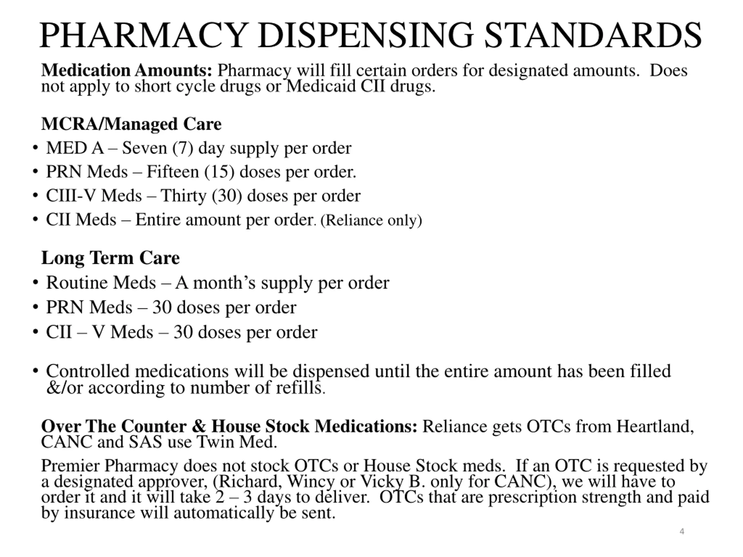 PHARMACY DISPENSING STANDARDS Medication Amounts: Pharmacy will fill certain orders for designated amounts. Does not apply to short cycle drugs or Medicaid CII drugs. MCRA/Managed Care MED A Seven (7) day supply per order PRN Meds Fifteen (15) doses per order. CIII-V Meds Thirty (30) doses per order CII Meds Entire amount per order. (Reliance only) Long Term Care Routine Meds A month s supply per order PRN Meds 30 doses per order CII V Meds 30 doses per order Controlled medications will be dispensed until the entire amount has been filled &/or according to number of refills. Over The Counter & House Stock Medications: Reliance gets OTCs from Heartland, CANC and SAS use Twin Med. Premier Pharmacy does not stock OTCs or House Stock meds. If an OTC is requested by a designated approver, (Richard, Wincy or Vicky B. only for CANC), we will have to order it and it will take 2 3 days to deliver. OTCs that are prescription strength and paid by insurance will automatically be sent. 4