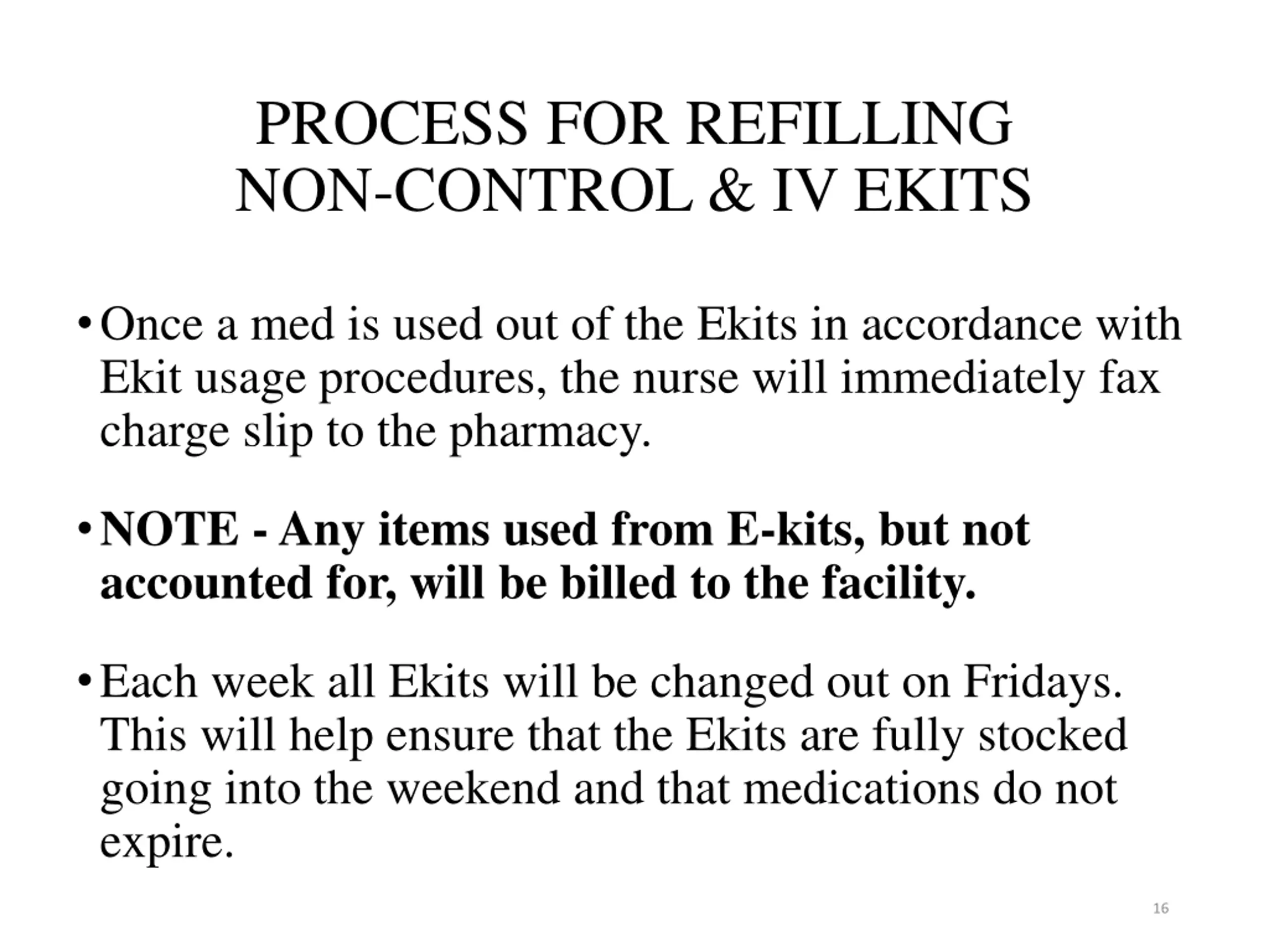 PROCESS FOR REFILLING NON-CONTROL & IV EKITS Once a med is used out of the Ekits in accordance with Ekit usage procedures, the nurse will immediately fax charge slip to the pharmacy. NOTE - Any items used from E-kits, but not accounted for, will be billed to the facility. Each week all Ekits will be changed out on Fridays. This will help ensure that the Ekits are fully stocked going into the weekend and that medications do not expire. 16