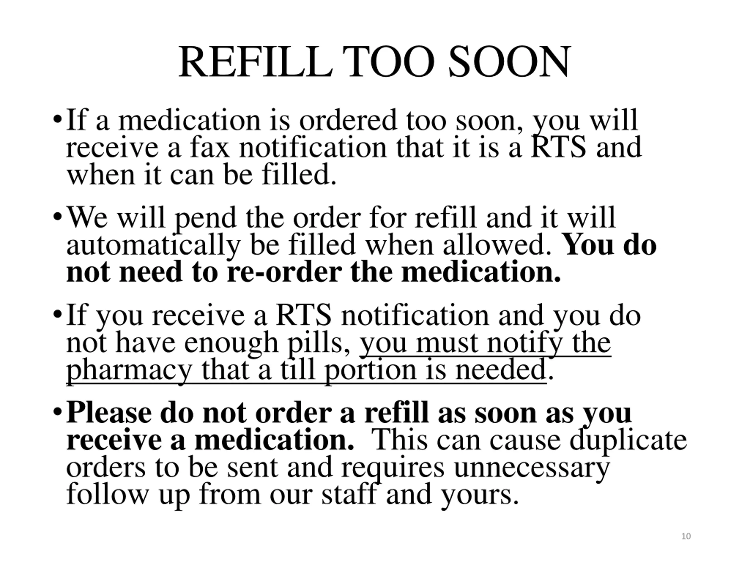 REFILL TOO SOON If a medication is ordered too soon, you will receive a fax notification that it is a RTS and when it can be filled. We will pend the order for refill and it will automatically be filled when allowed. You do not need to re-order the medication. If you receive a RTS notification and you do not have enough pills, you must notify the pharmacy that a till portion is needed. Please do not order a refill as soon as you receive a medication. This can cause duplicate orders to be sent and requires unnecessary follow up from our staff and yours. 10