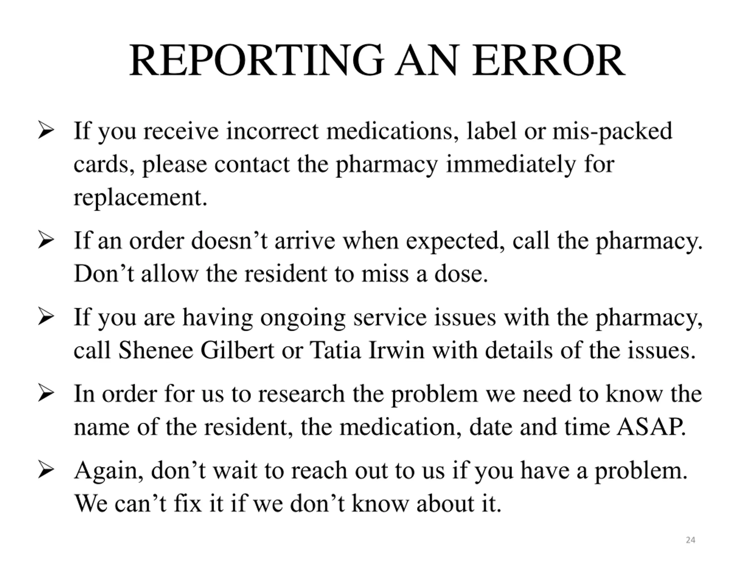 REPORTING AN ERROR If you receive incorrect medications, label or mis-packed cards, please contact the pharmacy immediately for replacement. If an order doesn t arrive when expected, call the pharmacy. Don t allow the resident to miss a dose. If you are having ongoing service issues with the pharmacy, call Shenee Gilbert or Tatia Irwin with details of the issues. In order for us to research the problem we need to know the name of the resident, the medication, date and time ASAP. Again, don t wait to reach out to us if you have a problem. We can t fix it if we don t know about it. 24