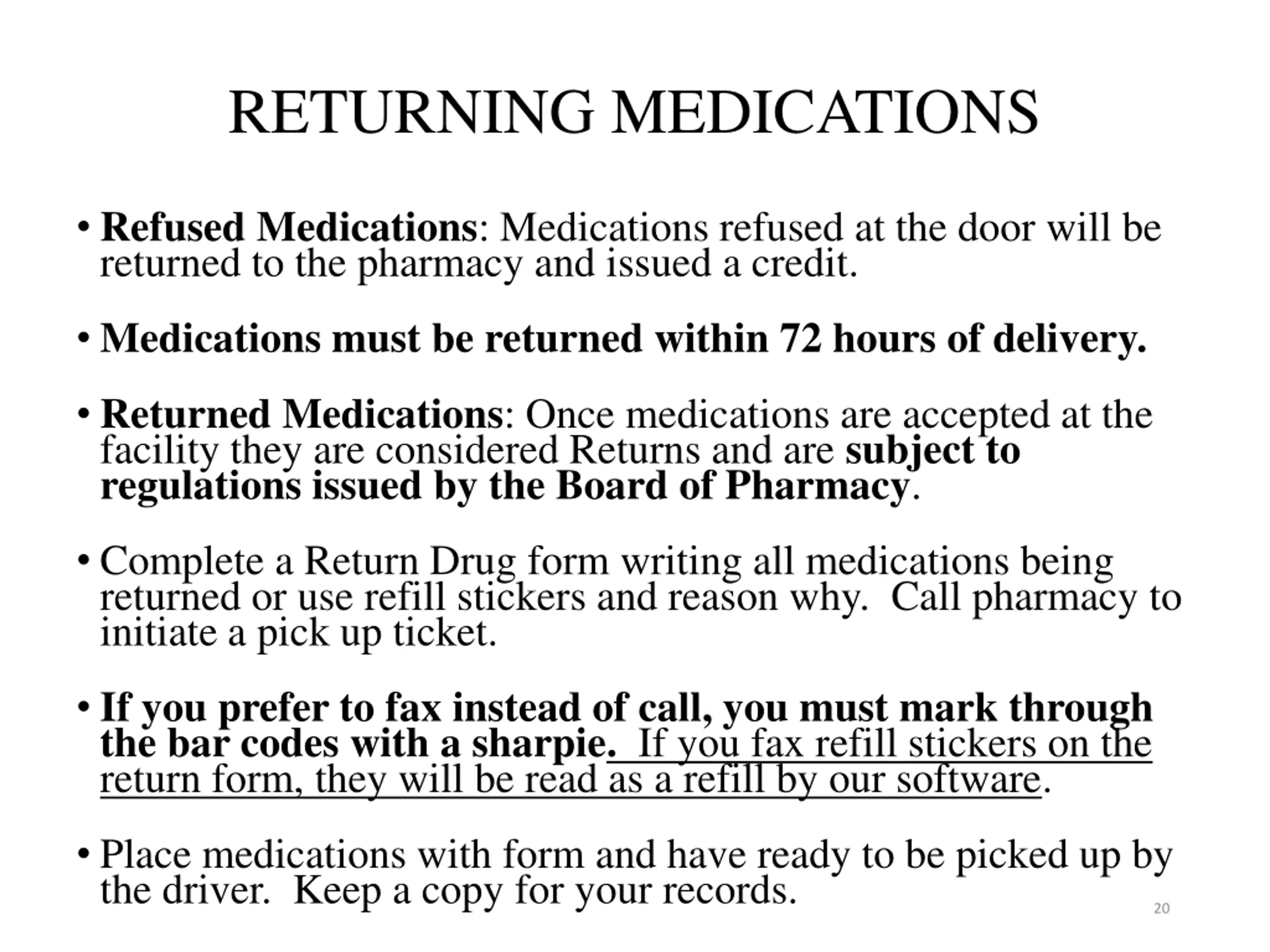 RETURNING MEDICATIONS Refused Medications: Medications refused at the door will be returned to the pharmacy and issued a credit. Medications must be returned within 72 hours of delivery. Returned Medications: Once medications are accepted at the facility they are considered Returns and are subject to regulations issued by the Board of Pharmacy. Complete a Return Drug form writing all medications being returned or use refill stickers and reason why. Call pharmacy to initiate a pick up ticket. If you prefer to fax instead of call, you must mark through the bar codes with a sharpie. If you fax refill stickers on the return form, they will be read as a refill by our software. Place medications with form and have ready to be picked up by the driver. Keep a copy for your records. 20