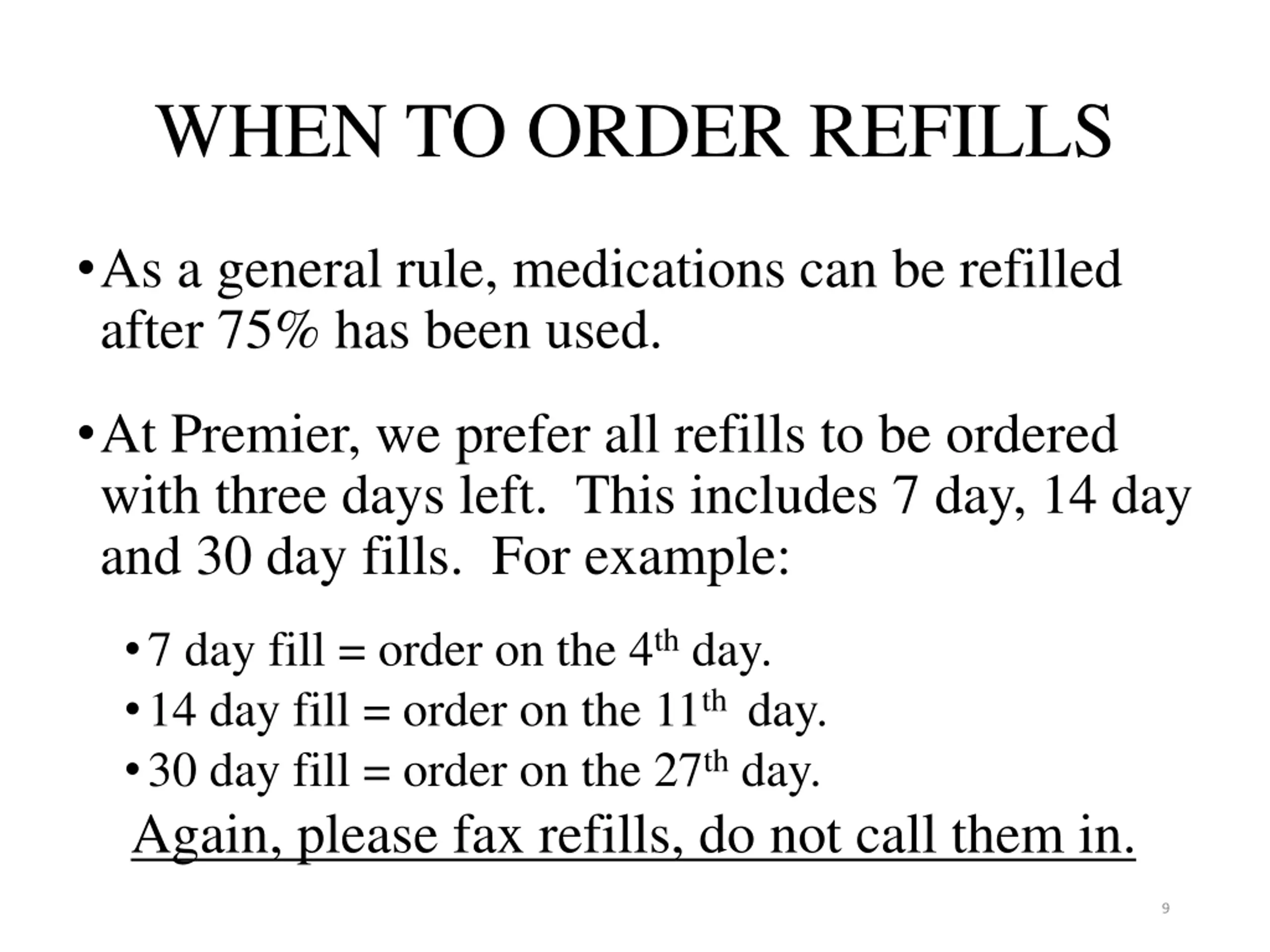 WHEN TO ORDER REFILLS As a general rule, medications can be refilled after 75% has been used. At Premier, we prefer all refills to be ordered with three days left. This includes 7 day, 14 day and 30 day fills. For example: 7 day fill = order on the 4th day. 14 day fill = order on the 11th day. 30 day fill = order on the 27th day. Again, please fax refills, do not call them in. 9
