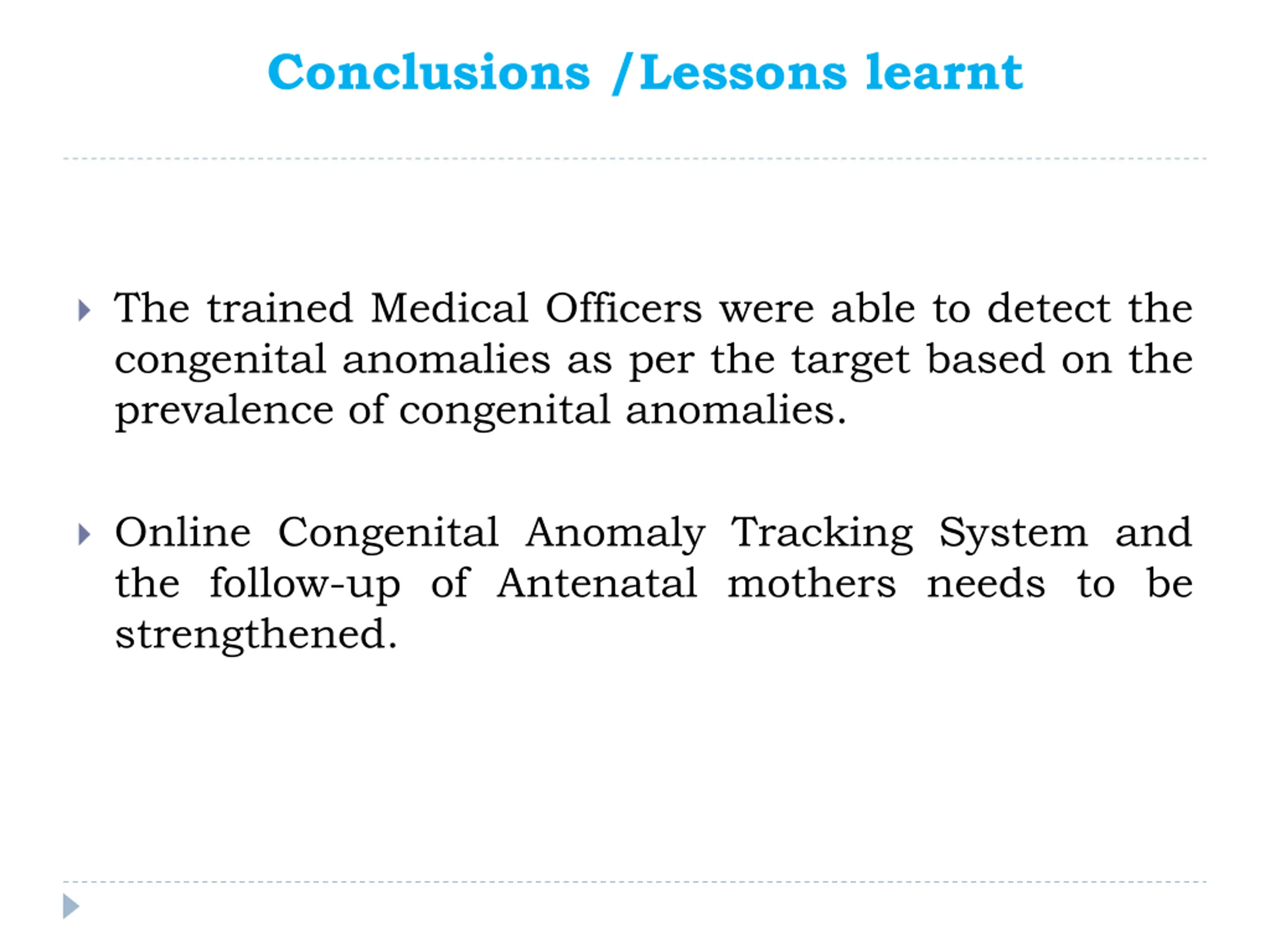 Conclusions /Lessons learnt The trained Medical Officers were able to detect the congenital anomalies as per the target based on the prevalence of congenital anomalies. Online Congenital Anomaly Tracking System and the follow-up of Antenatal mothers needs to be strengthened.