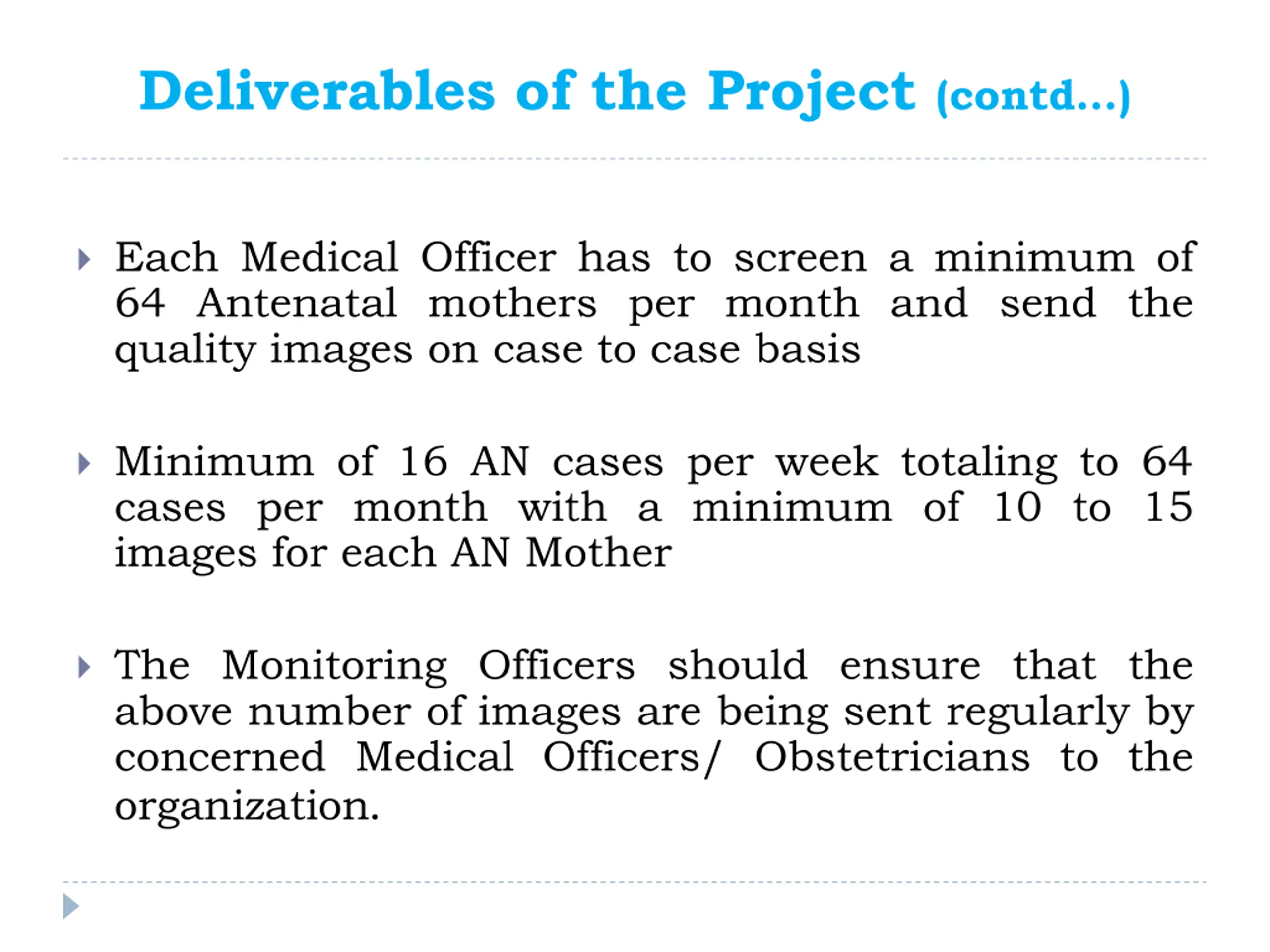 Deliverables of the Project (contd) Each Medical Officer has to screen a minimum of 64 Antenatal mothers per month and send the quality images on case to case basis Minimum of 16 AN cases per week totaling to 64 cases per month with a minimum of 10 to 15 images for each AN Mother The Monitoring Officers should ensure that the above number of images are being sent regularly by concerned Medical Officers/ Obstetricians to the organization.