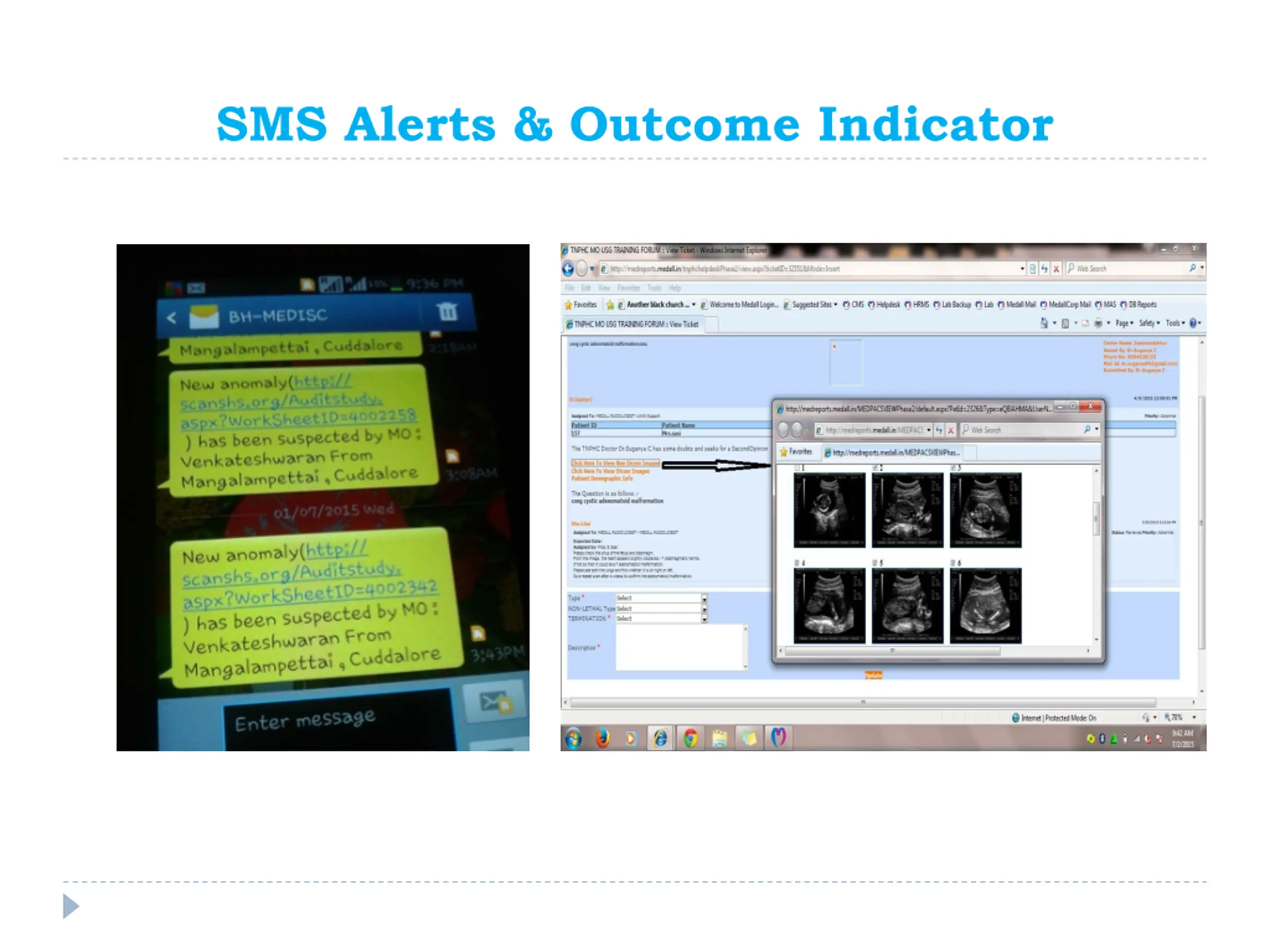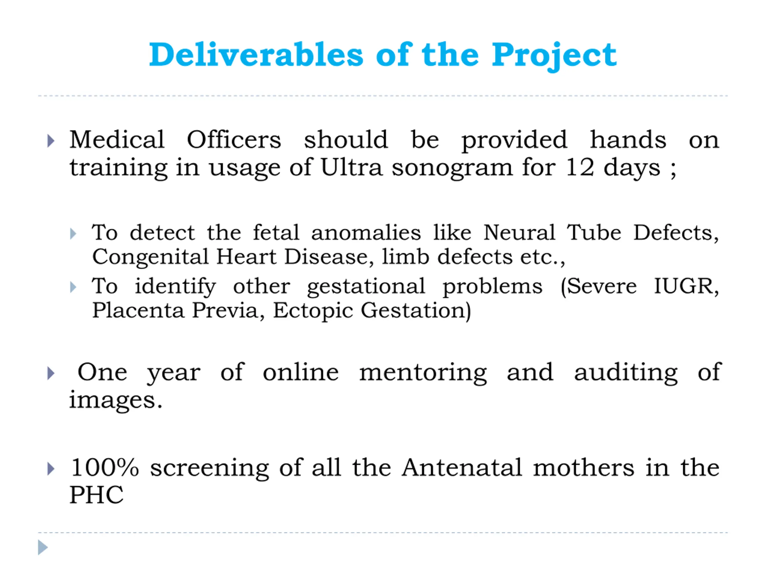 Deliverables of the Project Medical Officers should be provided hands on training in usage of Ultra sonogram for 12 days ; To detect the fetal anomalies like Neural Tube Defects, Congenital Heart Disease, limb defects etc., To identify other gestational problems (Severe IUGR, Placenta Previa, Ectopic Gestation) One year of online mentoring and auditing of images. 100% screening of all the Antenatal mothers in the PHC