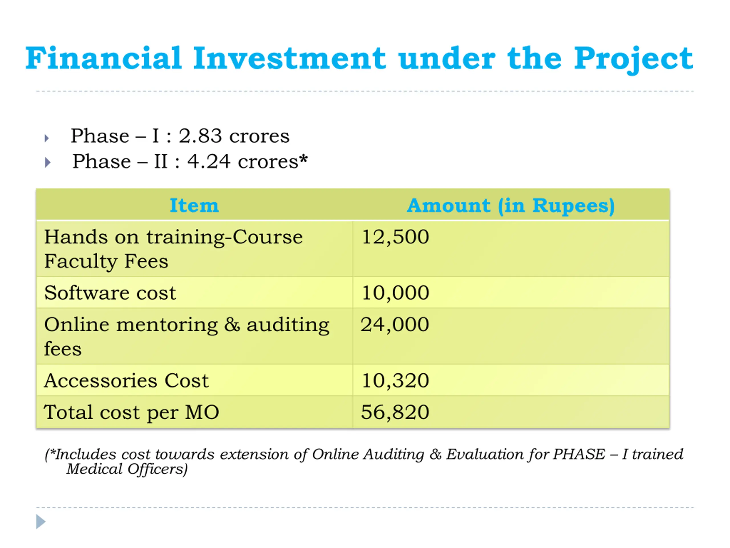 Financial Investment under the Project Phase I : 2.83 crores Phase II : 4.24 crores* Item Amount (in Rupees) 12,500 Hands on training-Course Faculty Fees Software cost Online mentoring & auditing fees Accessories Cost Total cost per MO 10,000 24,000 10,320 56,820 (*Includes cost towards extension of Online Auditing & Evaluation for PHASE I trained Medical Officers)