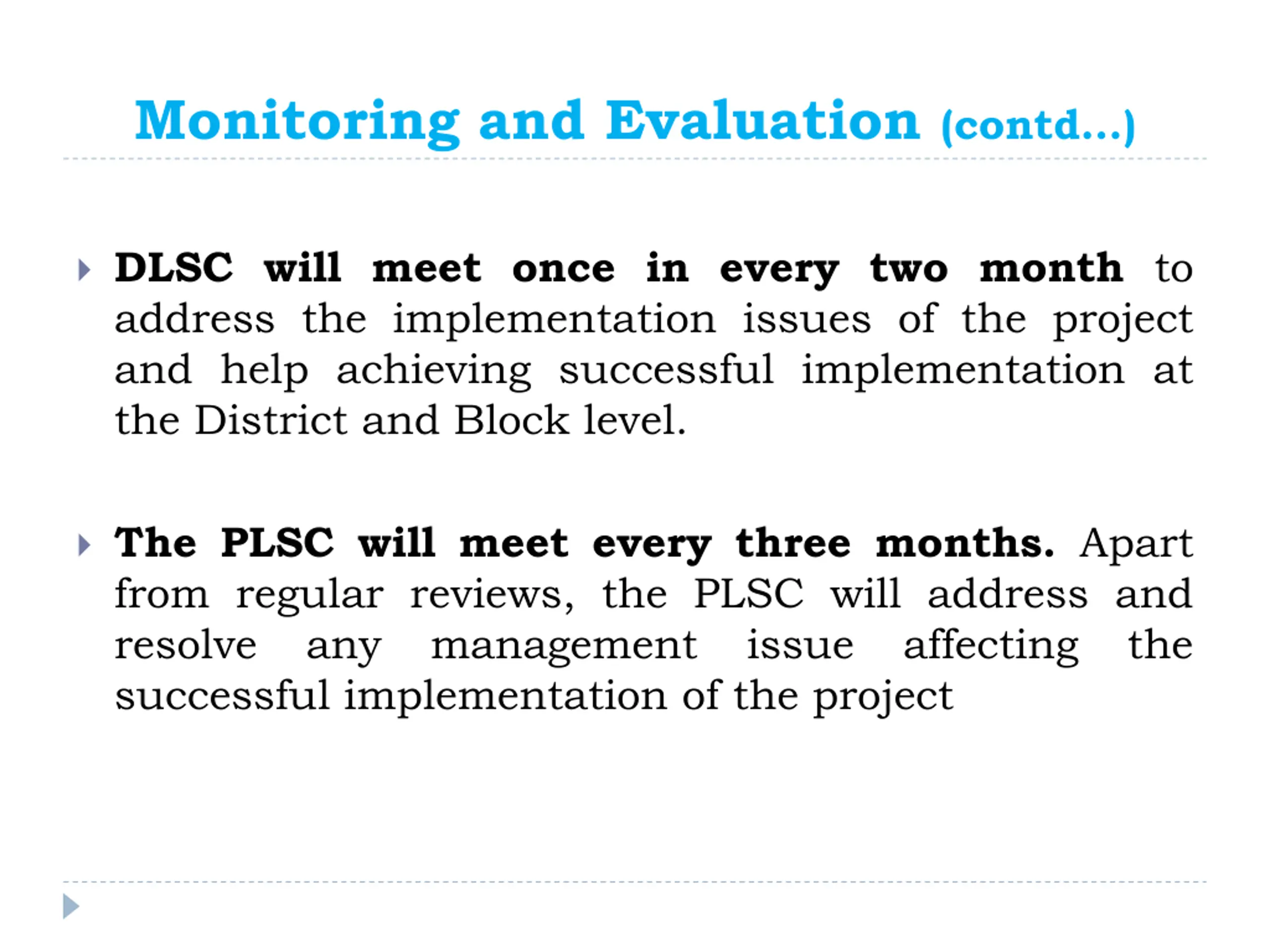 Monitoring and Evaluation (contd) DLSC will meet once in every two month to address the implementation issues of the project and help achieving successful implementation at the District and Block level. The PLSC will meet every three months. Apart from regular reviews, the PLSC will address and resolve any management issue affecting the successful implementation of the project