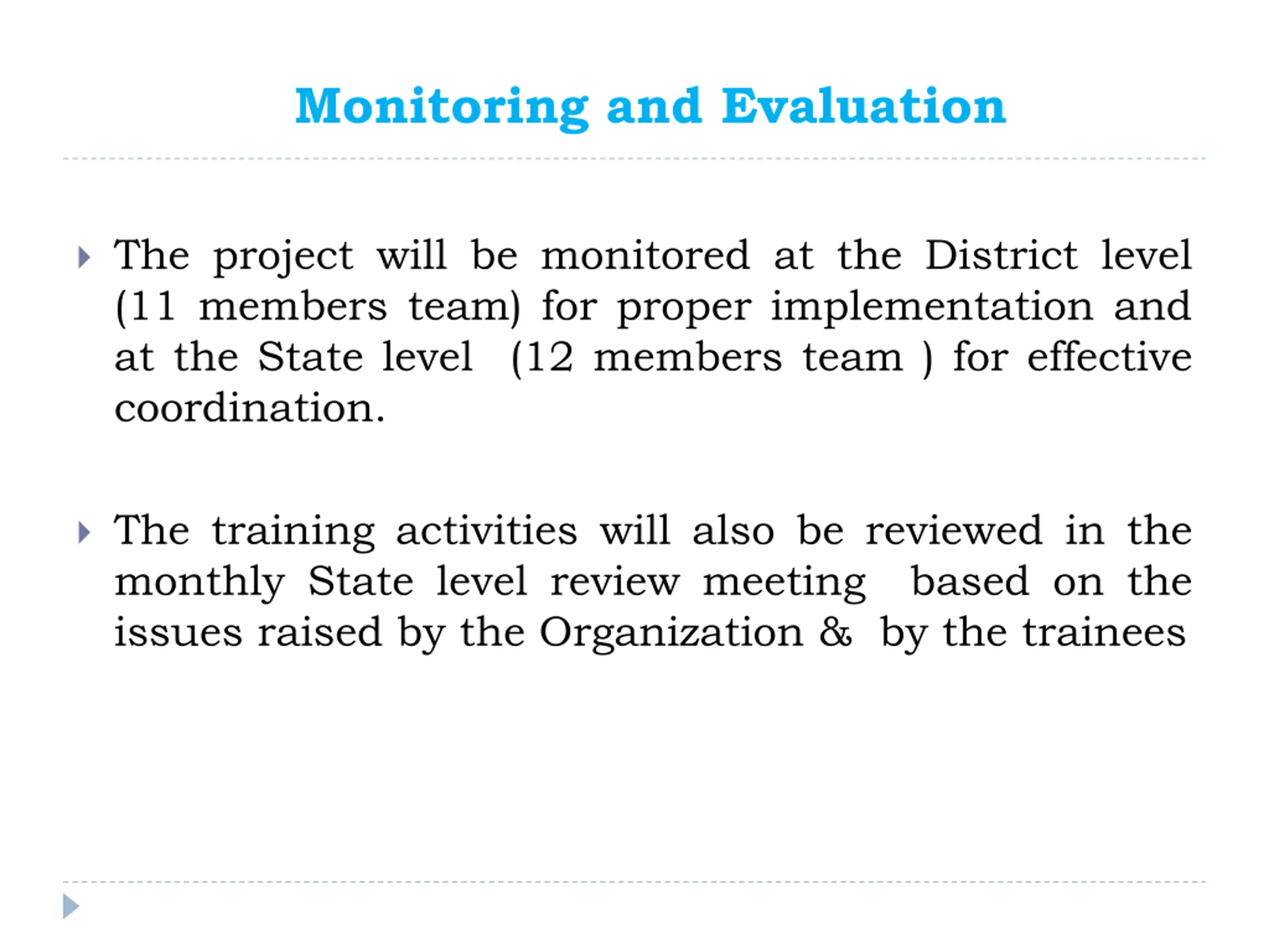 Monitoring and Evaluation The project will be monitored at the District level (11 members team) for proper implementation and at the State level (12 members team ) for effective coordination. The training activities will also be reviewed in the monthly State level review meeting based on the issues raised by the Organization & by the trainees