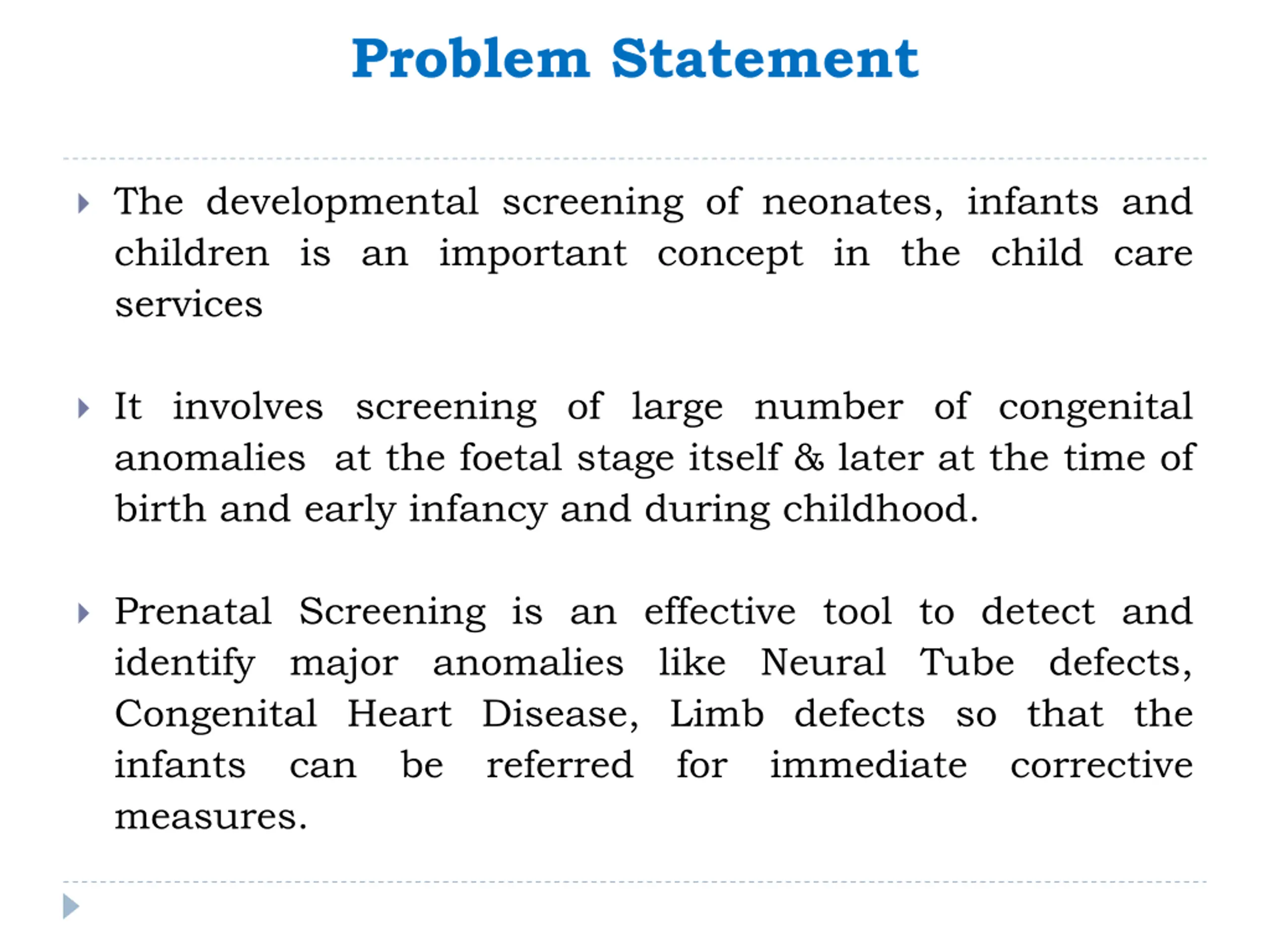 Problem Statement The developmental screening of neonates, infants and children is an important concept in the child care services It involves screening of large number of congenital anomalies at the foetal stage itself & later at the time of birth and early infancy and during childhood. Prenatal Screening is an effective tool to detect and identify major anomalies like Neural Tube defects, Congenital Heart Disease, Limb defects so that the infants can be referred for immediate corrective measures.