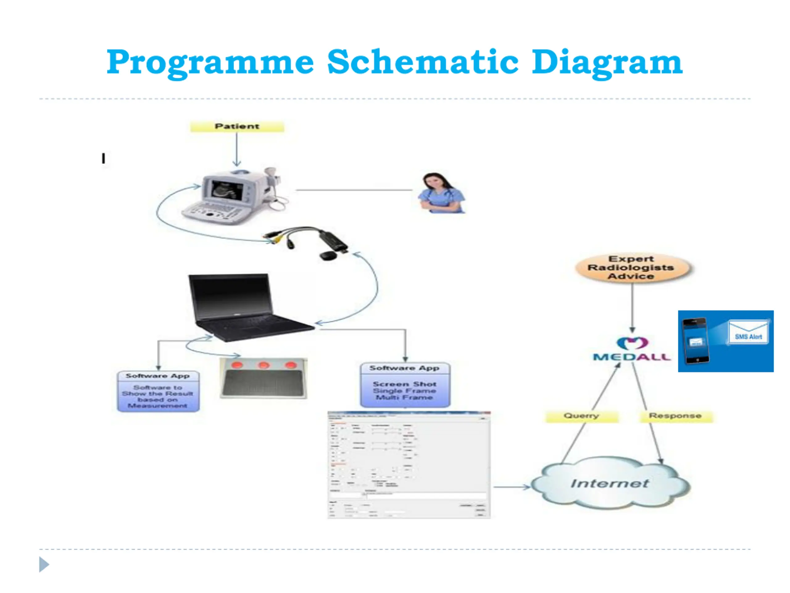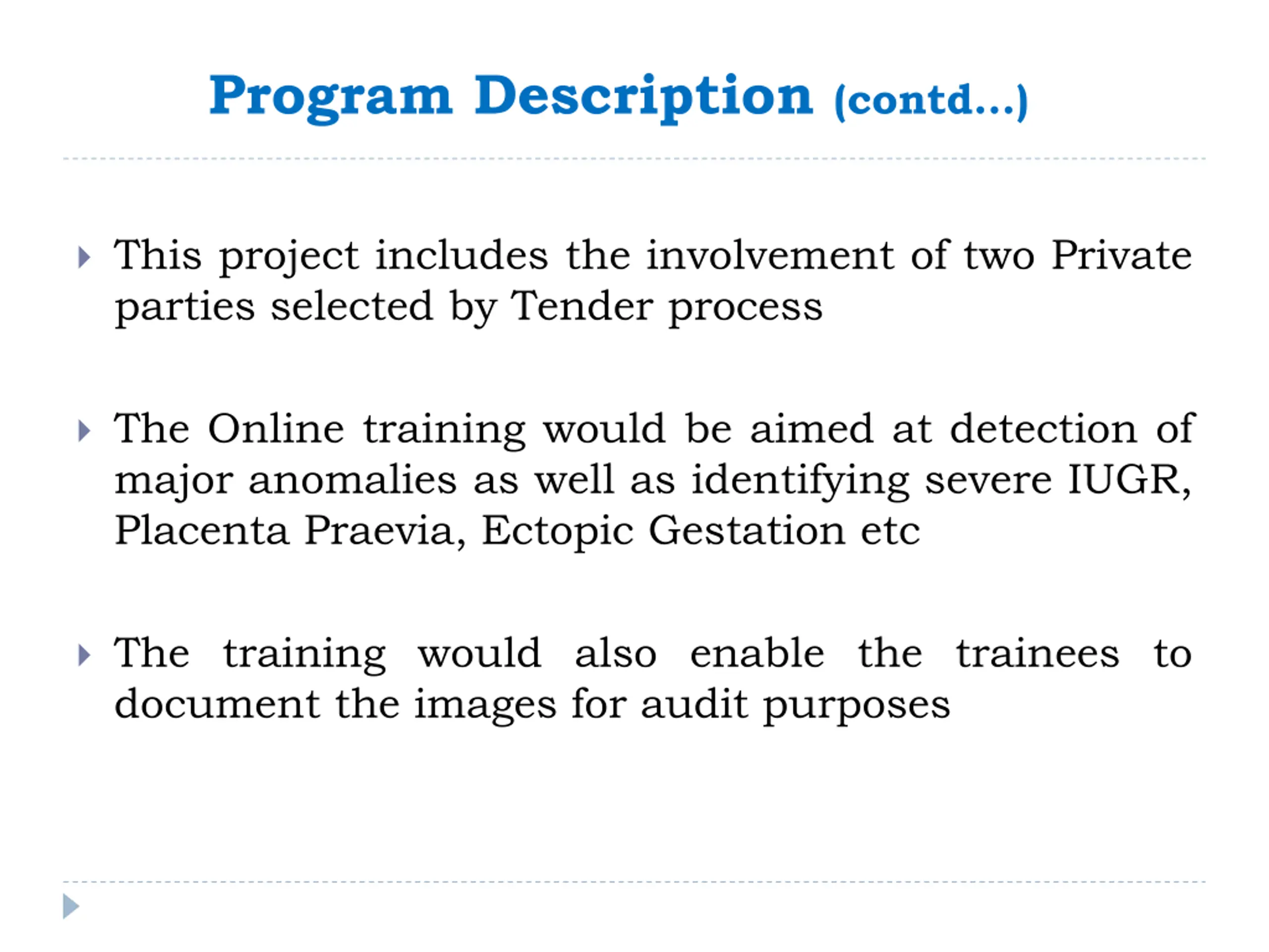 Program Description (contd) This project includes the involvement of two Private parties selected by Tender process The Online training would be aimed at detection of major anomalies as well as identifying severe IUGR, Placenta Praevia, Ectopic Gestation etc The training would also enable the trainees to document the images for audit purposes