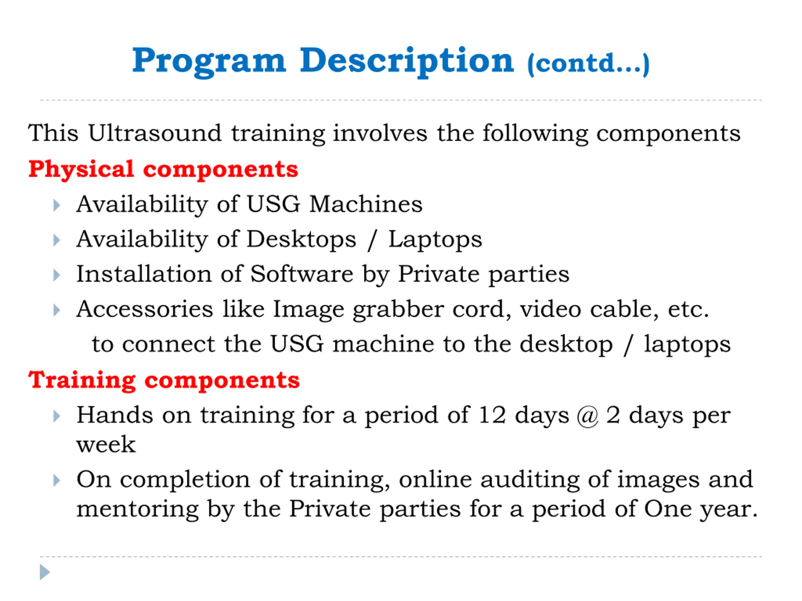 Program Description (contd) This Ultrasound training involves the following components Physical components Availability of USG Machines Availability of Desktops / Laptops Installation of Software by Private parties Accessories like Image grabber cord, video cable, etc. to connect the USG machine to the desktop / laptops Training components Hands on training for a period of 12 days @ 2 days per week On completion of training, online auditing of images and mentoring by the Private parties for a period of One year.