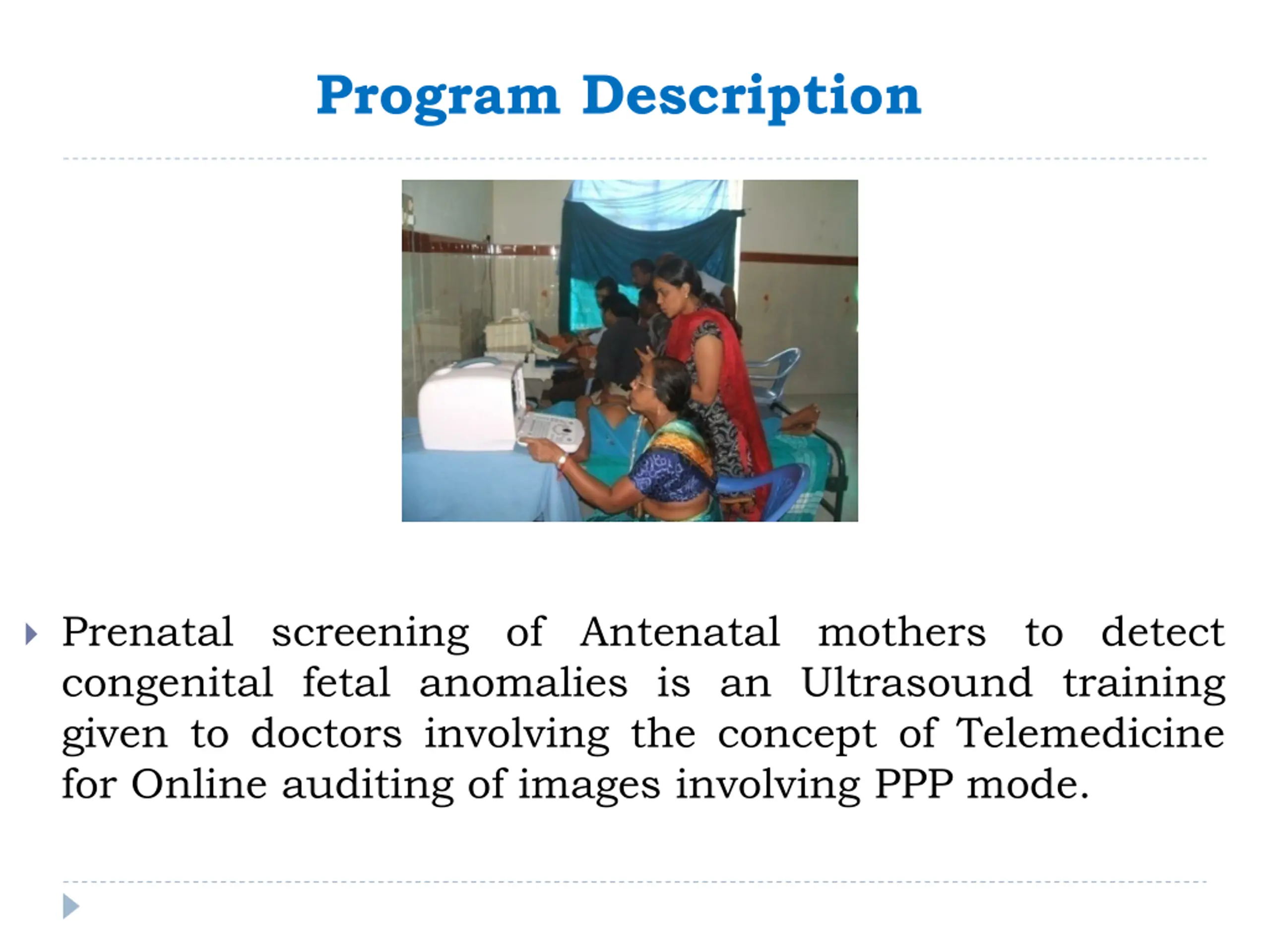 Program Description Prenatal screening of Antenatal mothers to detect congenital fetal anomalies is an Ultrasound training given to doctors involving the concept of Telemedicine for Online auditing of images involving PPP mode.