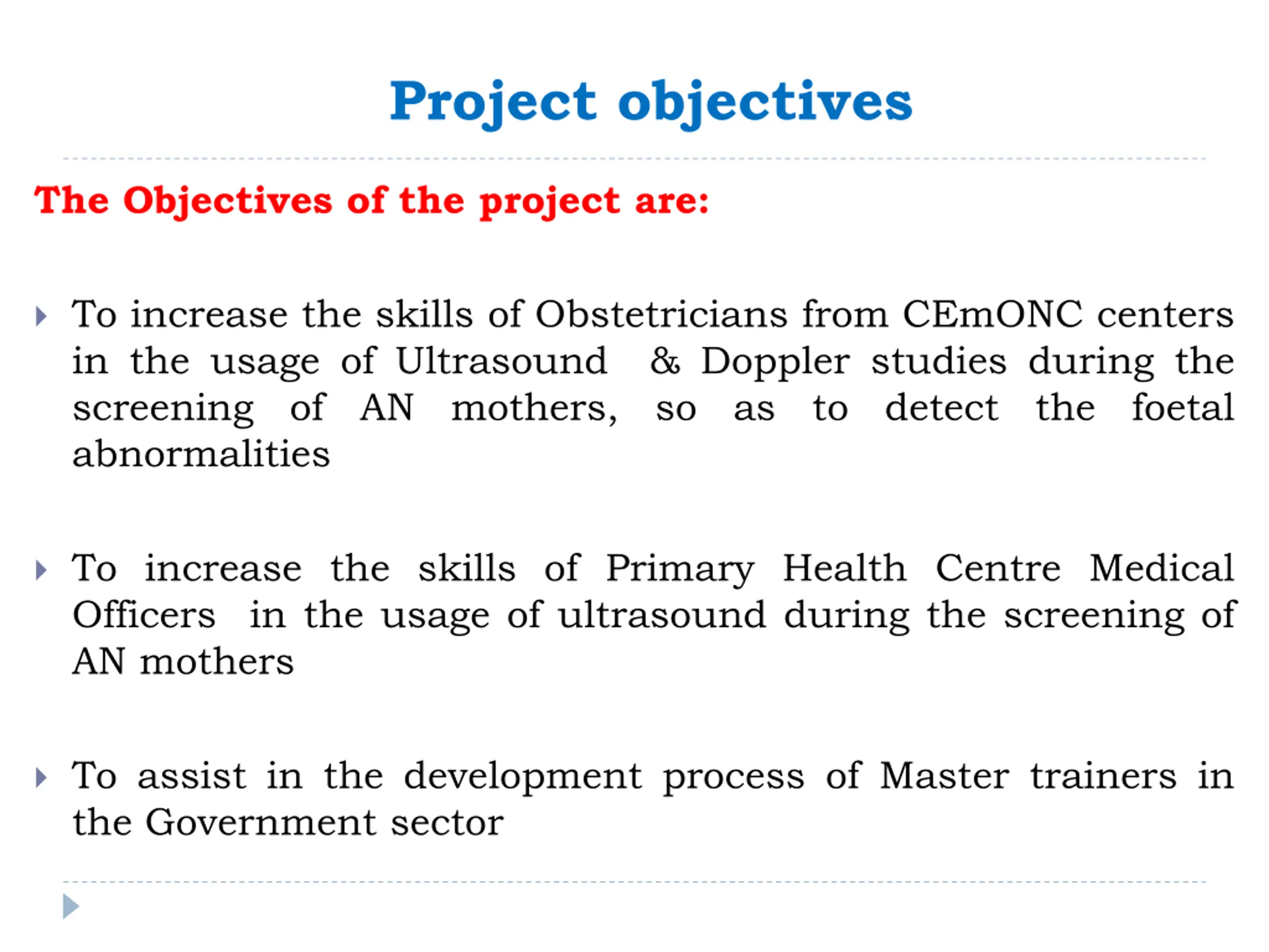 Project objectives The Objectives of the project are: To increase the skills of Obstetricians from CEmONC centers in the usage of Ultrasound & Doppler studies during the screening of AN mothers, so as to detect the foetal abnormalities To increase the skills of Primary Health Centre Medical Officers in the usage of ultrasound during the screening of AN mothers To assist in the development process of Master trainers in the Government sector