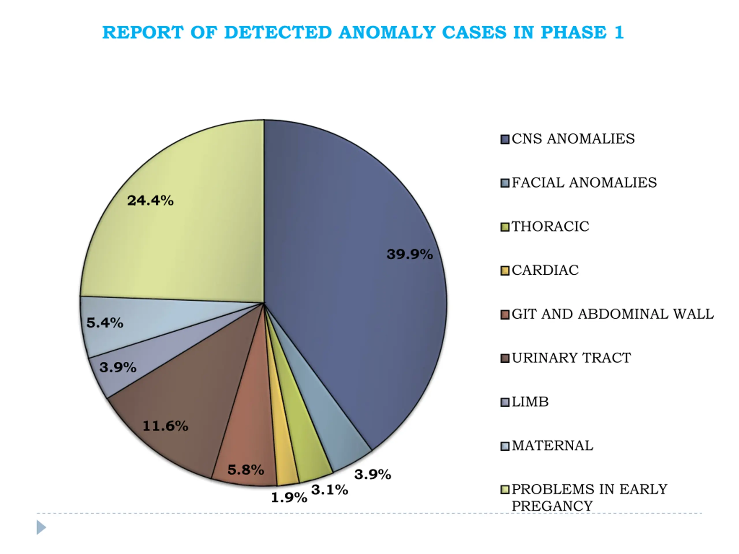 REPORT OF DETECTED ANOMALY CASES IN PHASE 1 CNS ANOMALIES FACIAL ANOMALIES 24.4% THORACIC 39.9% CARDIAC GIT AND ABDOMINAL WALL 5.4% URINARY TRACT 3.9% LIMB 11.6% MATERNAL 5.8% 3.9% PROBLEMS IN EARLY PREGANCY 3.1% 1.9%
